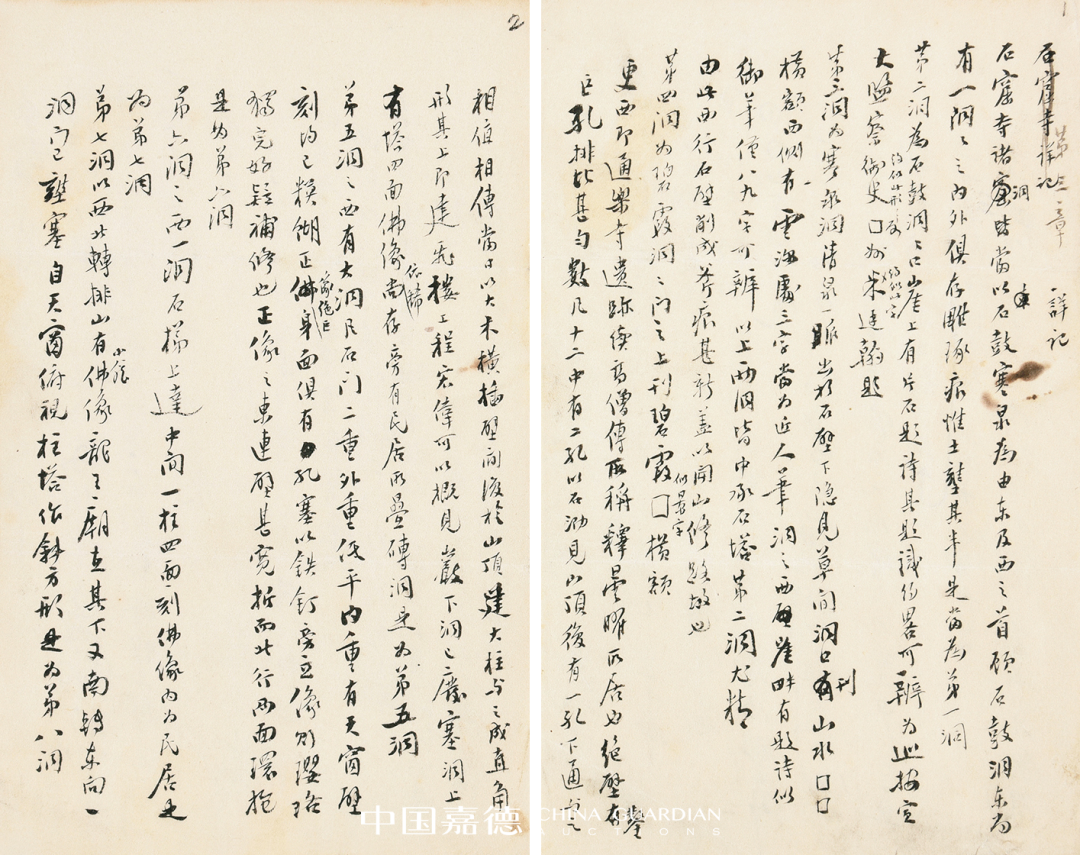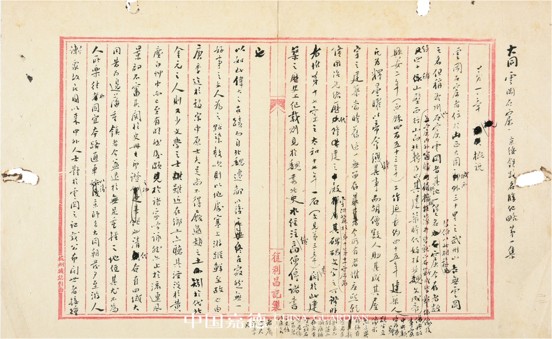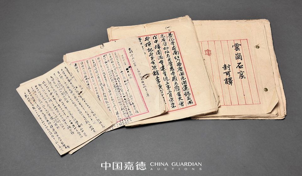 此件为瞿宣颖撰《大同云冈石窟》(京绥铁路名胜纪略第一 集)以及《大同游记》、《大同游记续》等,共32页,记录京绥铁路通车后乘车游大同之所见、所闻、所感,所用为京绥铁路管理局等红 栏稿纸。另有瞿宣颖抄录塚本靖《云冈石窟》、关野贞《云冈及龙 门》、松本文三郎《云冈之雕像》、《五十四人造像题记》等关于大 同云冈石窟文献一册四十余页。
