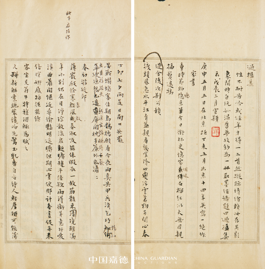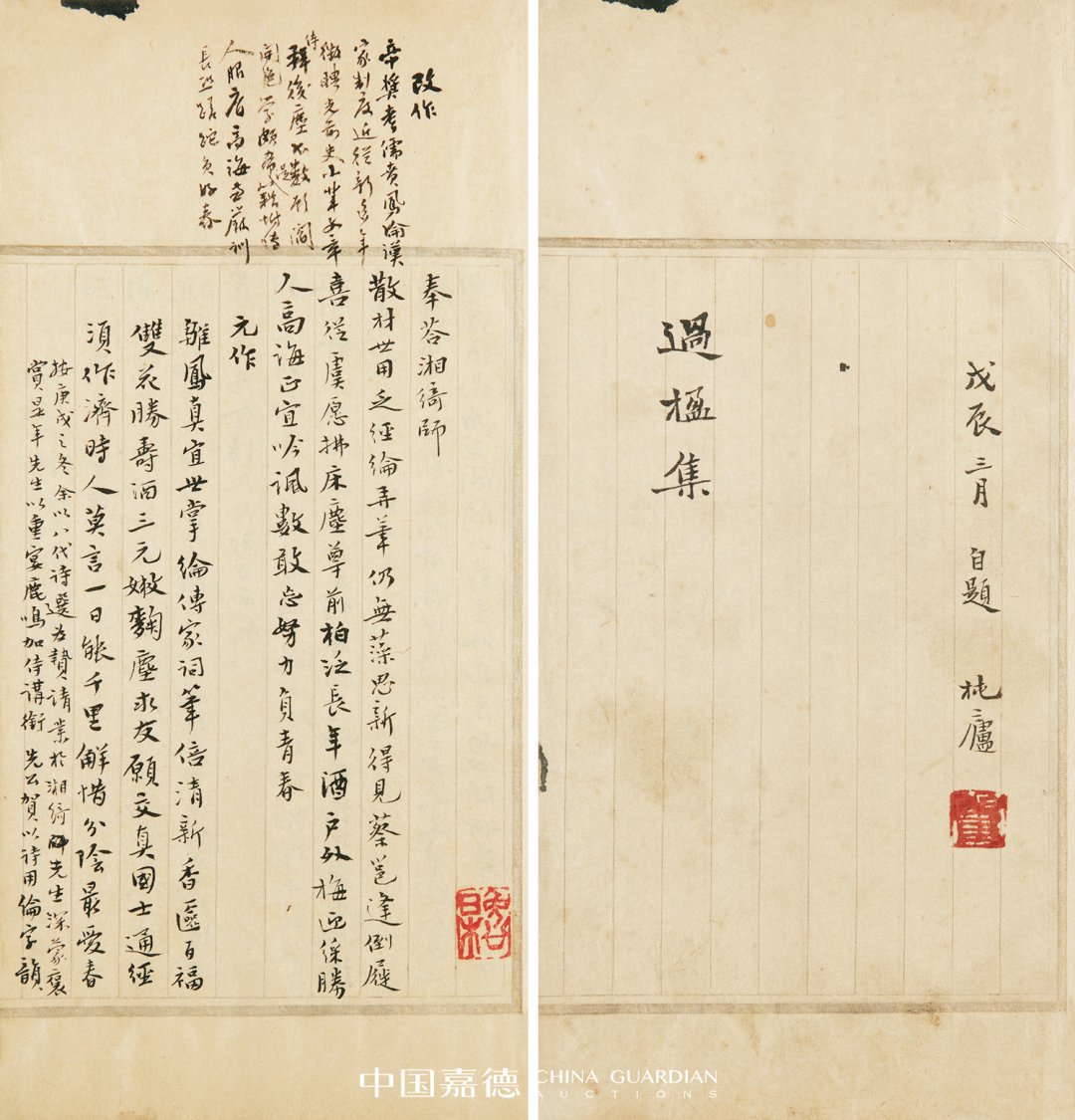 题识:1、过楹集,铢庵四十已前所作诗。2、过楹集,戊辰三月自 题,杶庐。3、性不耐苦吟,或经年才得一二首,然踪迹情绪赖此存 其影象间,时自玩如温旧梦,故钞为一册,取《墨经》语题曰《过楹 集》云。戊辰三月,宣颖。此件内收瞿宣颖四十岁前所作《奉答湘绮师》、《次韵和陈弢庵史》、《晚桂》、《自题画松》等诗词百余首,有圈改与增删。
