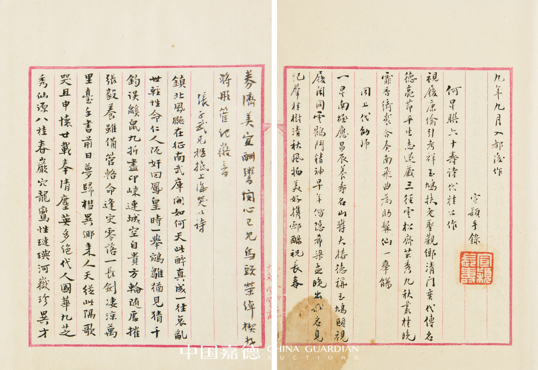 此件所用为袌璞斋写经格稿纸,封面题“袌璞斋诗稿”,内文首题“袌璞斋诗,癸丑”。内收《奉和觙师上湘绮次樊山韵》、《樊山翁以词报余画扇赋倦寻芳为谢》、《游汤山记》、《题蔡震华伉俪双影》等诗词,多按照年月编排。