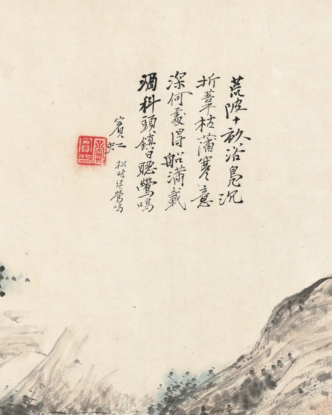 本幅黄宾虹题“大千社兄”中此“社”应为烂漫社。黄宾虹曾题张大千自写照“欧阳永叔年方逾冠,自称醉翁。今大千社兄甫三旬……观此自写照,尤为钦佩不已”。据“大千社兄甫三旬”推知创作时间约为一九二九年。黄宾虹于一九二八年在上海与张 大千兄弟等组织同人书画社团烂漫社,并被推举为社长,故其题张大千自写照称张为“社兄”。因此本幅当为黄宾虹六十岁以后的作品。