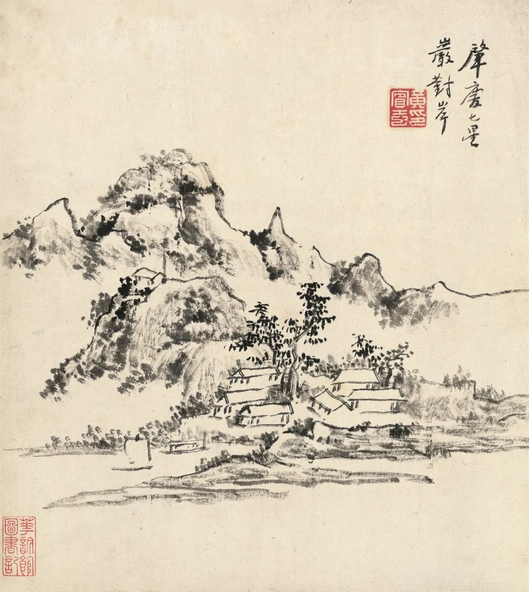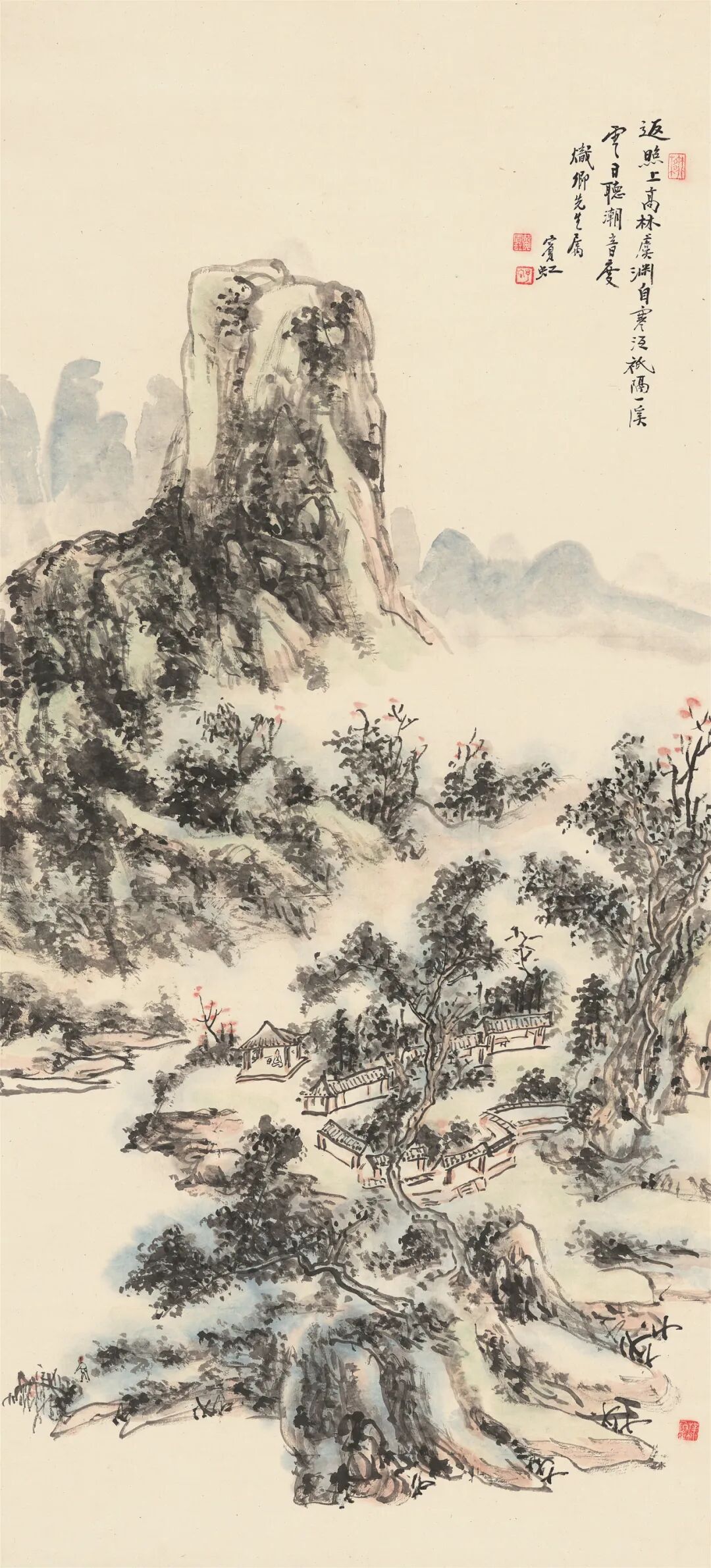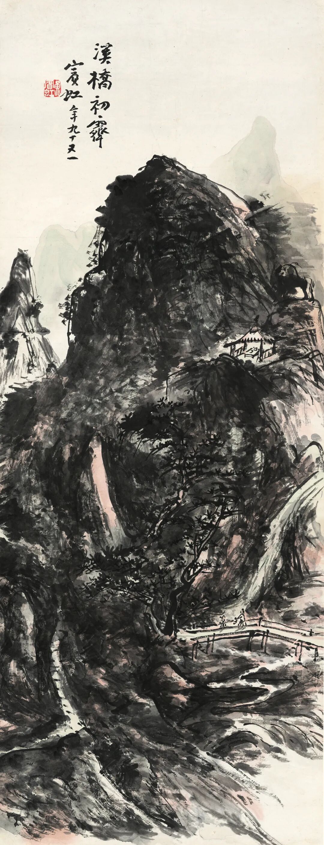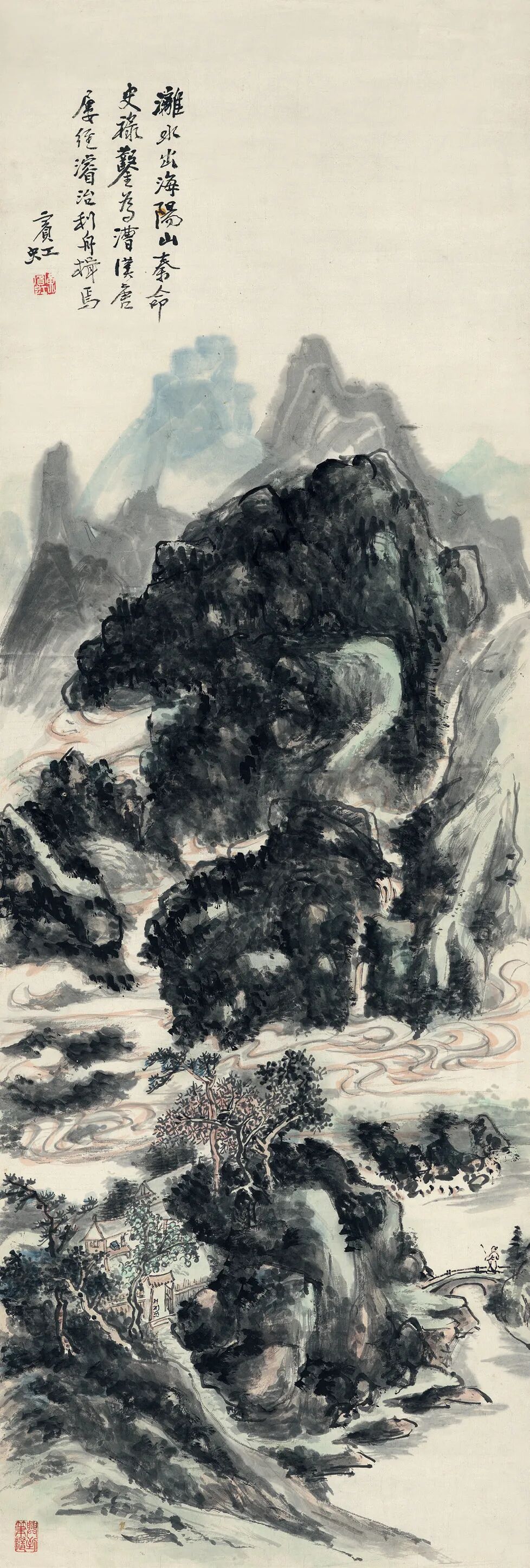 签条:黄山老人晚年山水妙品。明是草堂藏画也,癸未年七月□记。出版:1.《中国当代绘画展》图5,日本中国大使馆文化部举办,日本东京,1991年。2.《冰上鸿飞·黄宾虹书画集》封面、封底及P62,上海人民美术出版社,2004年。3.《中国近现代名家翰墨选》图4,西泠印社出版社,2006年。4.《吴昌硕·齐白石·黄宾虹书画选》图61,人民美术出版社,2012年。5.《虹叟书画集·纪念黄宾虹诞辰一百五十周年》P377,浙江人民美术出版社,2014年。展览:6.“中国当代绘画展”,原胜书店,1991年7月至8月。说明:黄宾虹晚年因白内障视力几无,八十八岁左右进入“黑宾虹”的伟大时期,九十一岁又因手术恢复视力,看似画面黑灰结合、重现灰白,实则人生与画理之境界超前未有。因仍兼有较“黑”的画法,又罕见施以青绿红斑,故此作当作于九十一岁视力刚恢复的短暂时期。画作未写上款,可视为是为自己创作的实验性作品。年份珍贵、设色罕见、未有上款:同时满足三者因素的画作在市场中几乎不存。