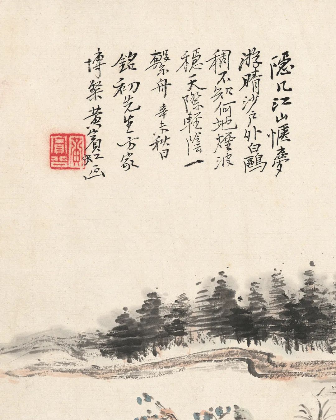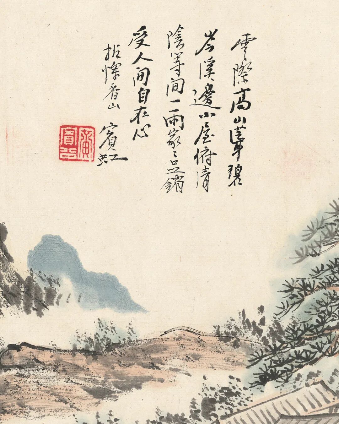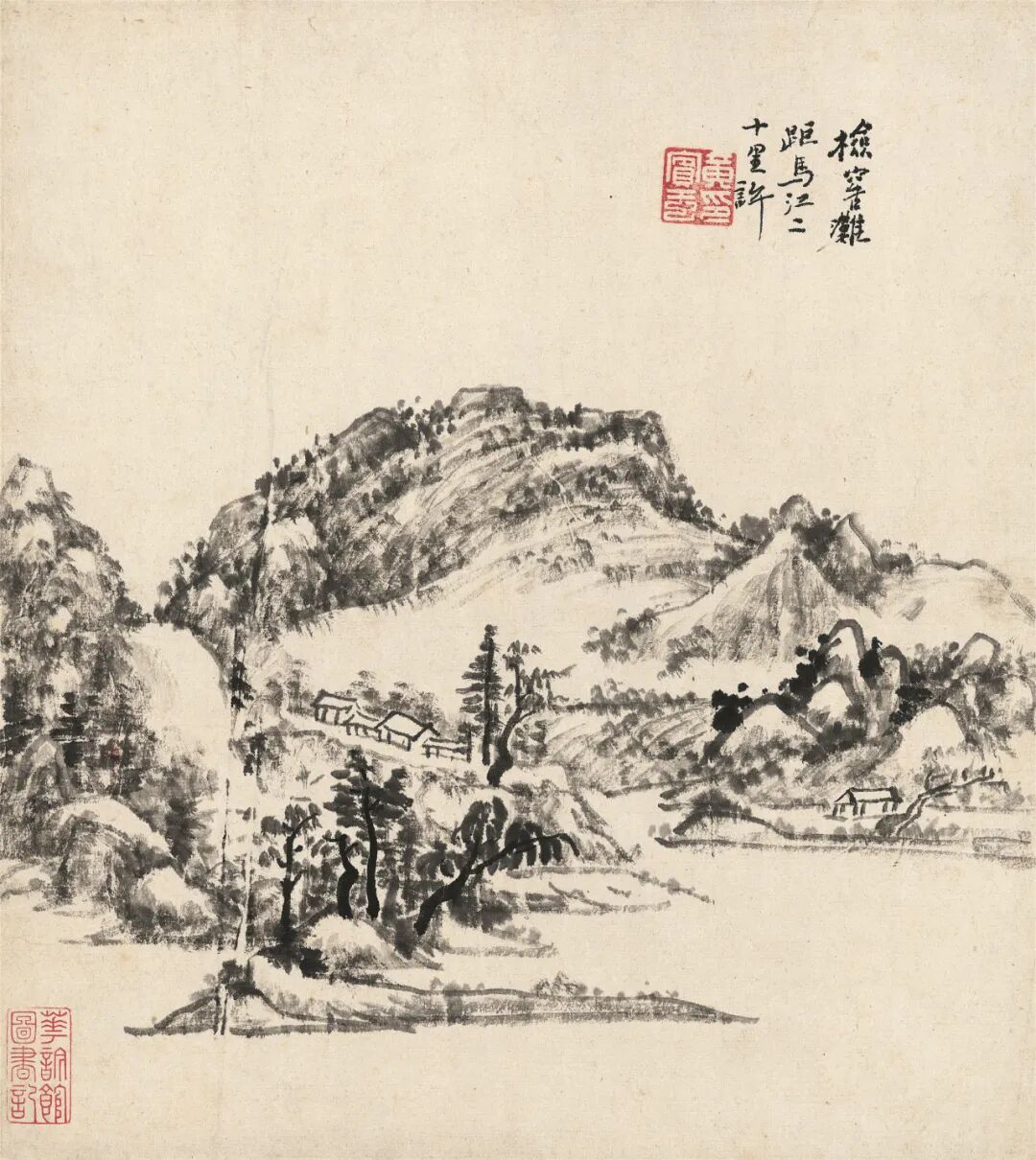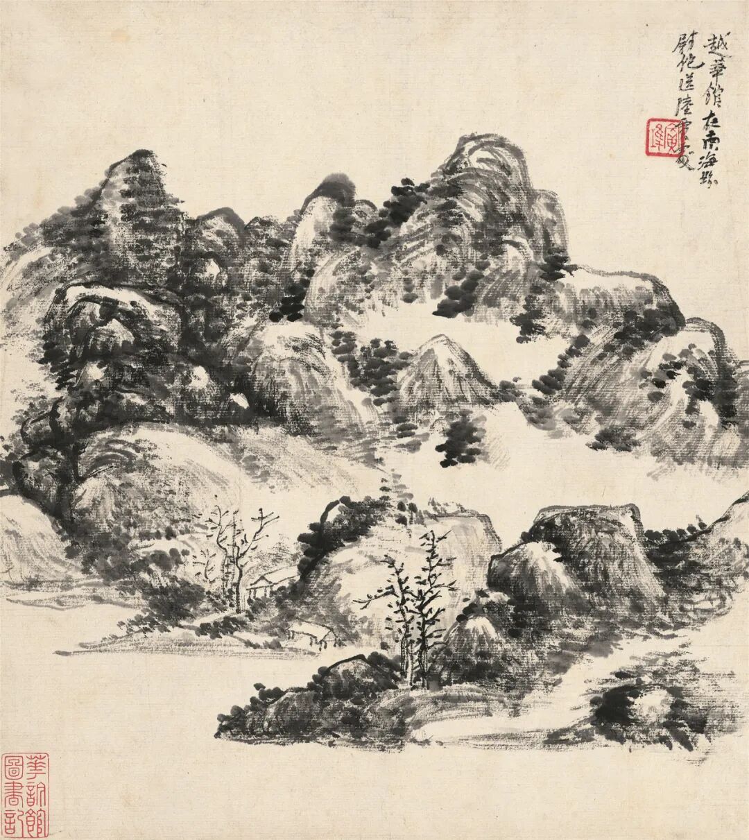 签条:黄山老人晚年山水妙品。明是草堂藏画也,癸未年七月□记。出版:1.《中国当代绘画展》图5,日本中国大使馆文化部举办,日本东京,1991年。2.《冰上鸿飞·黄宾虹书画集》封面、封底及P62,上海人民美术出版社,2004年。3.《中国近现代名家翰墨选》图4,西泠印社出版社,2006年。4.《吴昌硕·齐白石·黄宾虹书画选》图61,人民美术出版社,2012年。5.《虹叟书画集·纪念黄宾虹诞辰一百五十周年》P377,浙江人民美术出版社,2014年。展览:6.“中国当代绘画展”,原胜书店,1991年7月至8月。说明:黄宾虹晚年因白内障视力几无,八十八岁左右进入“黑宾虹”的伟大时期,九十一岁又因手术恢复视力,看似画面黑灰结合、重现灰白,实则人生与画理之境界超前未有。因仍兼有较“黑”的画法,又罕见施以青绿红斑,故此作当作于九十一岁视力刚恢复的短暂时期。画作未写上款,可视为是为自己创作的实验性作品。年份珍贵、设色罕见、未有上款:同时满足三者因素的画作在市场中几乎不存。