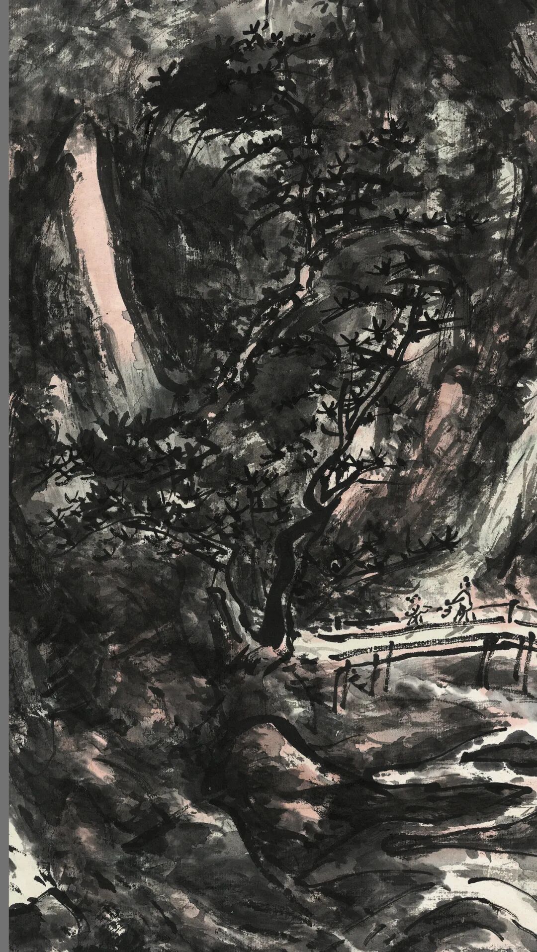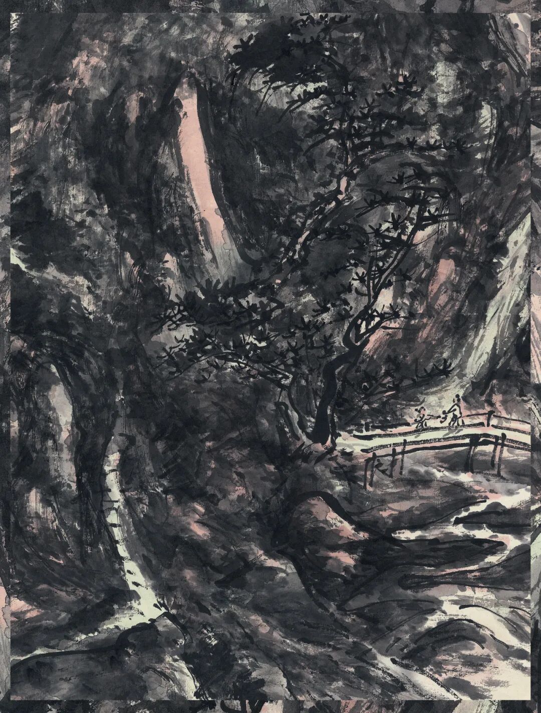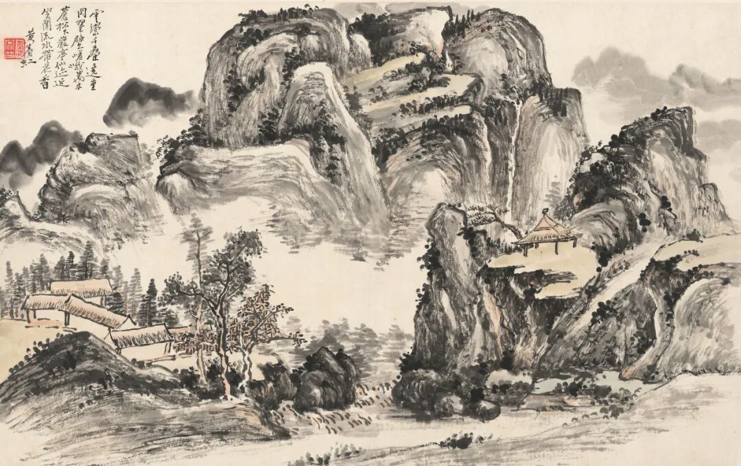 黄宾虹八十九岁因白内障视力几无,九十岁经过白内障手术后双目复明。这个阶段的山水看似画面黑灰结合、重现灰白,实则人生于画理之境界超前未有。