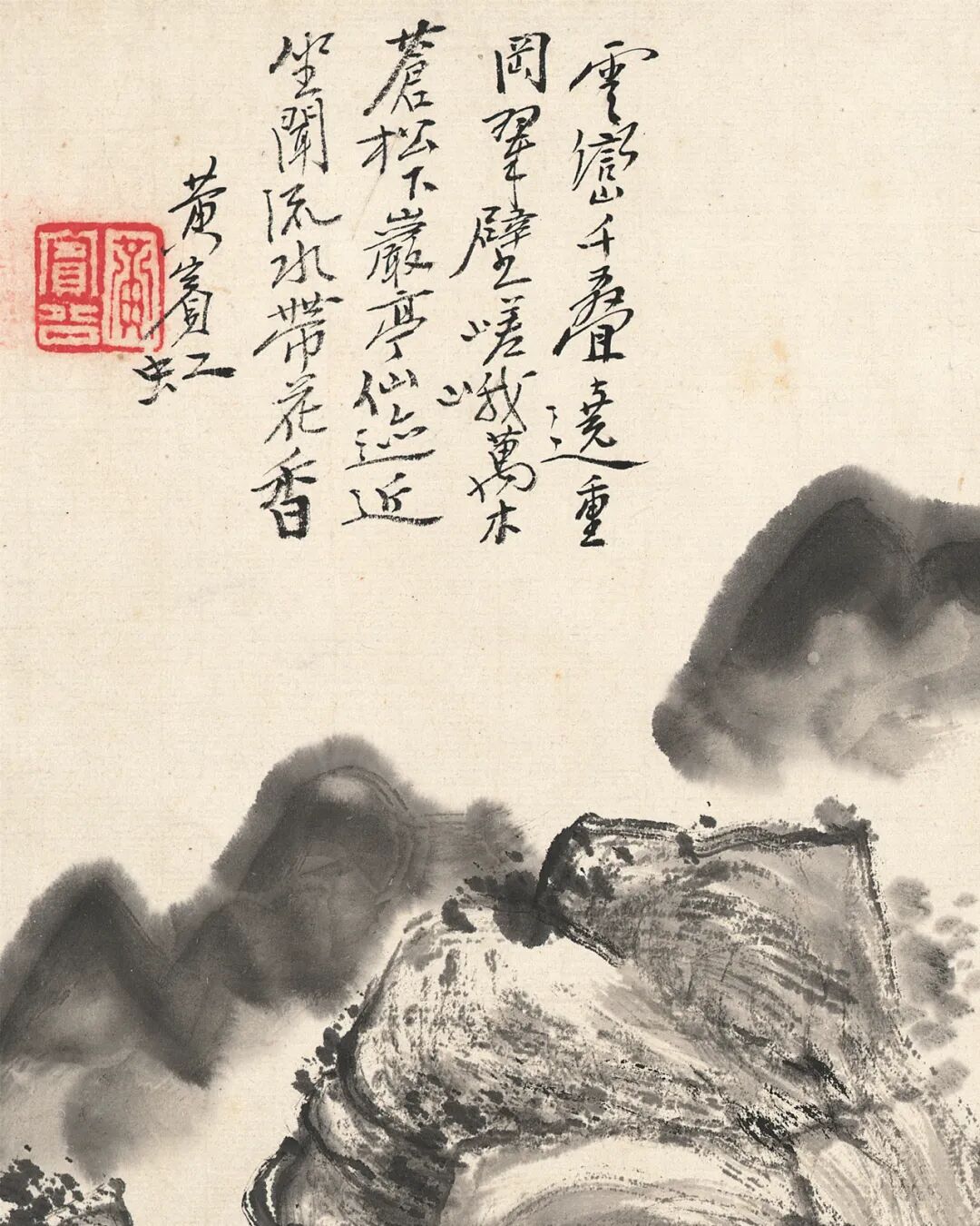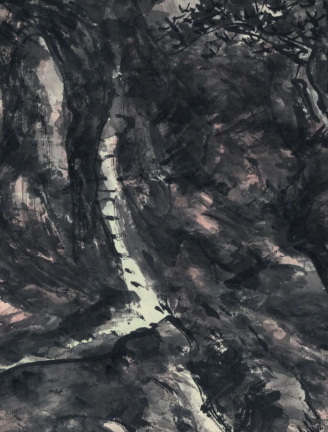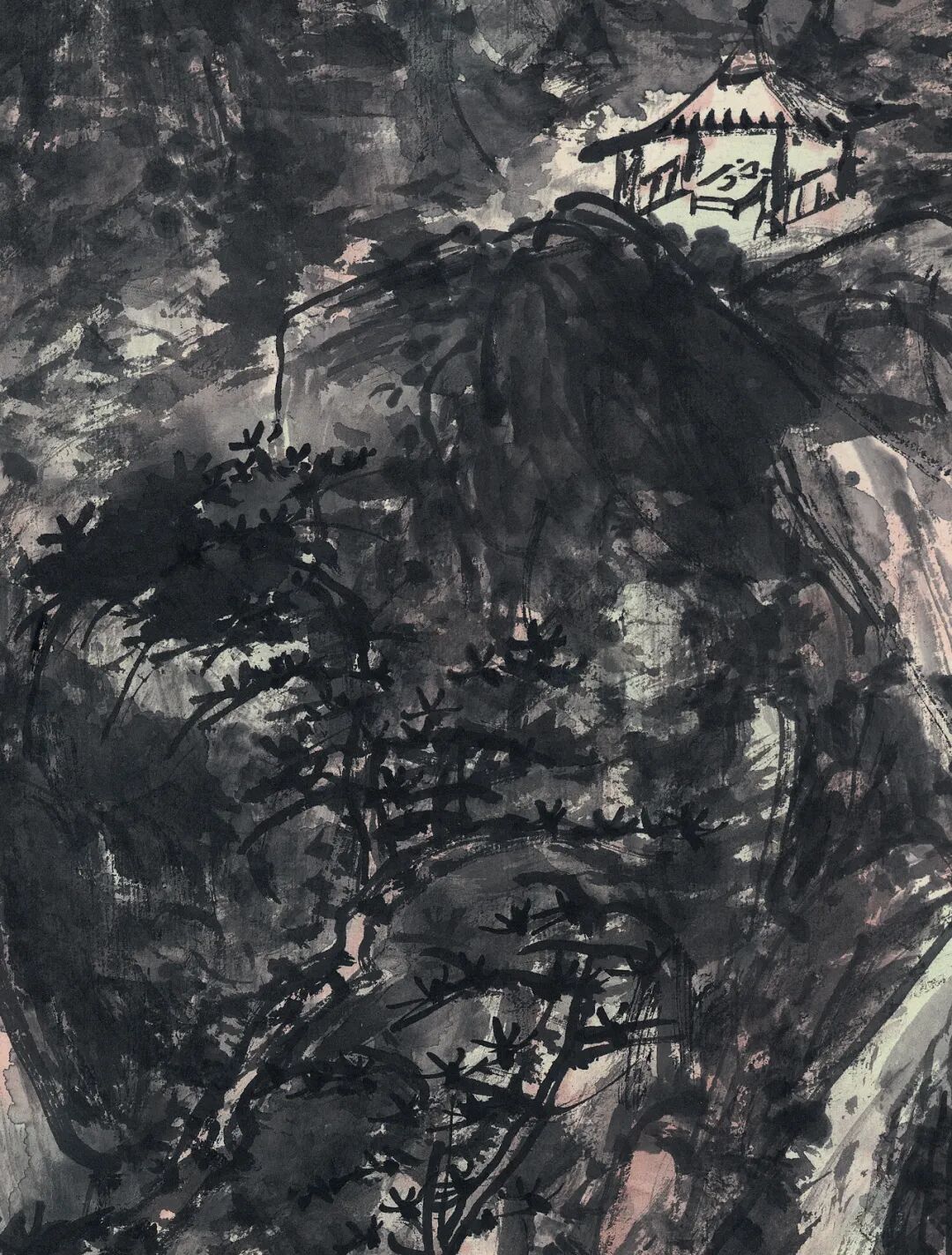 黄宾虹八十九岁因白内障视力几无,九十岁经过白内障手术后双目复明。这个阶段的山水看似画面黑灰结合、重现灰白,实则人生于画理之境界超前未有。