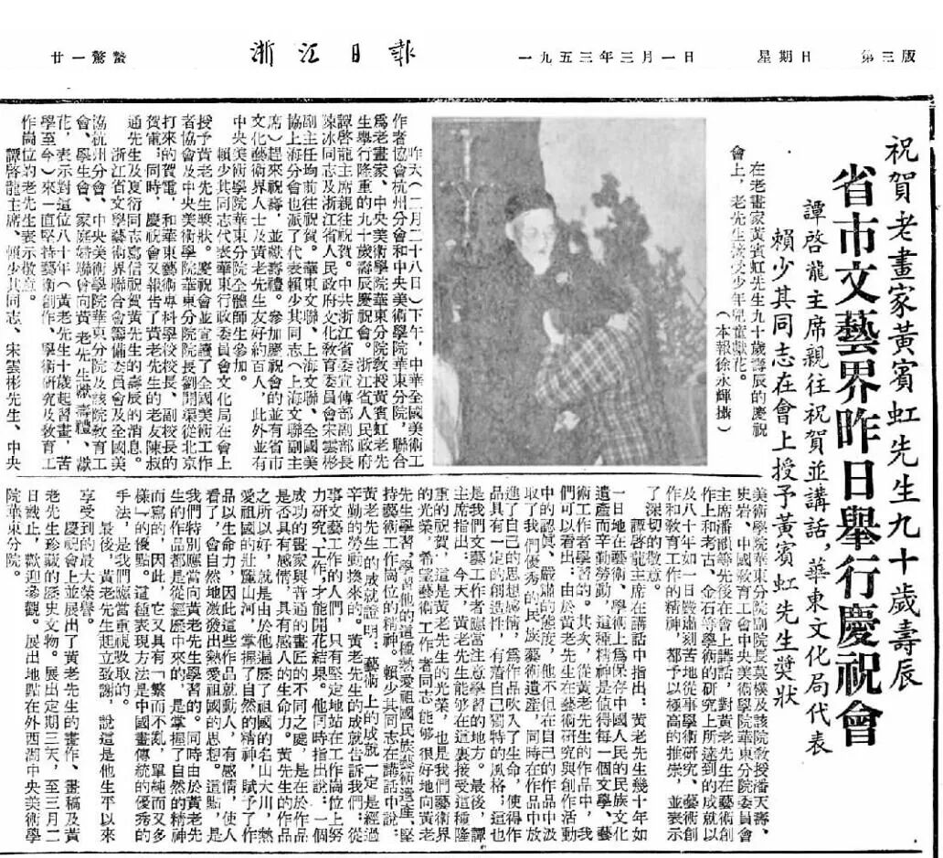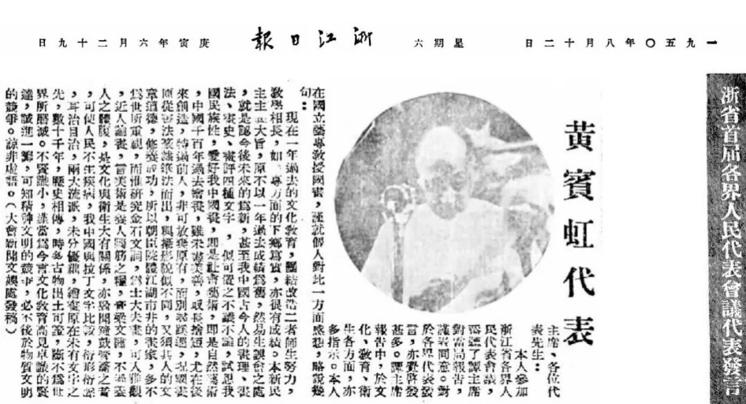 1950年8月12日《浙江日报》整版刊登了浙江省各界人民代表会议代表发言。作为最年长的代表,黄宾虹先生表示:本人在国立艺专教授国画,谨就个人对此一方面感想,略说几句。本新民主主义大旨,原不以一年过去成绩为旧,然易生误会之处,就是认今后未来的为新,甚至我中国古今人的画理、画法、画史、画评四种文字,似可置之不议不论。试思我国民族性,爱好我中国画,即是社会艺术,即是自然艺术。中国千百年过去绘画,虽未尽美善,取长舍短,尤在后来创造,特过前人,非可放弃原有,而别寻蹊迳。况国画原从书法篆隶笔法而出,与摄影貌似不同,又须其人的文章道德,修养成功。所以朝臣院体江湖市井的画家,多不为世所重视,而惟研究金石文词,为士大夫画,可人雅观。近人论画,言美术是养人脑筋之粮,膏粱文绣,不过养人之体腹,是文化与卫生大有关系,亦犹闻钟鼓管钥之音,可使人民不生疾病。我中国与拉丁文字比较,衍形衍声,耳治目治,两大流派,未分优绌。绘画原在未有文字之先,数十千年,历史相传,时多古物出土可证,断不为世界所磨灭。不贤识小,谨当为今言文化教育高见卓识的贤达,诚进一筹,可知精神文明的竞争,必不后于物质文明的竞争。谅非虚语。