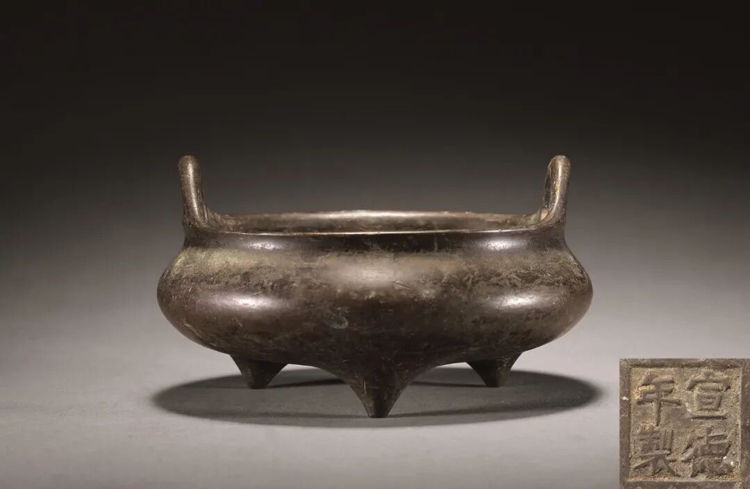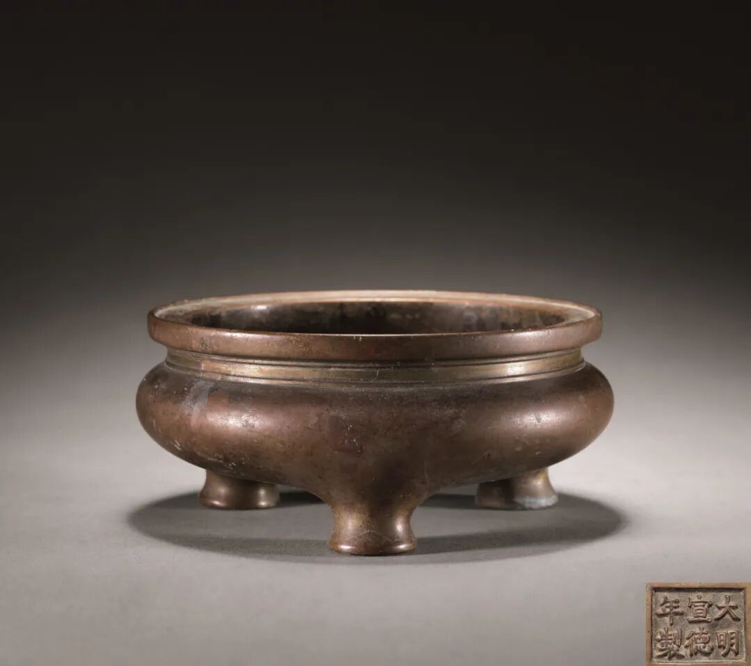 本件拍品口沿宽平,折沿束颈,颈起双弦,鼓腹下收,顺势出三足,足底平阔,壮硕有力,整器线条凝练,浑厚沉着,中正大气。通体光素,色泽统一,宝光内蕴。铜质精纯,硕大沉重。炉底中央铸刻“大明宣德年製”六字楷书款,底平字峻,规矩有度,乃与炉身一体失蜡法铸就,铸后又精修而成,颇有凌厉之感。