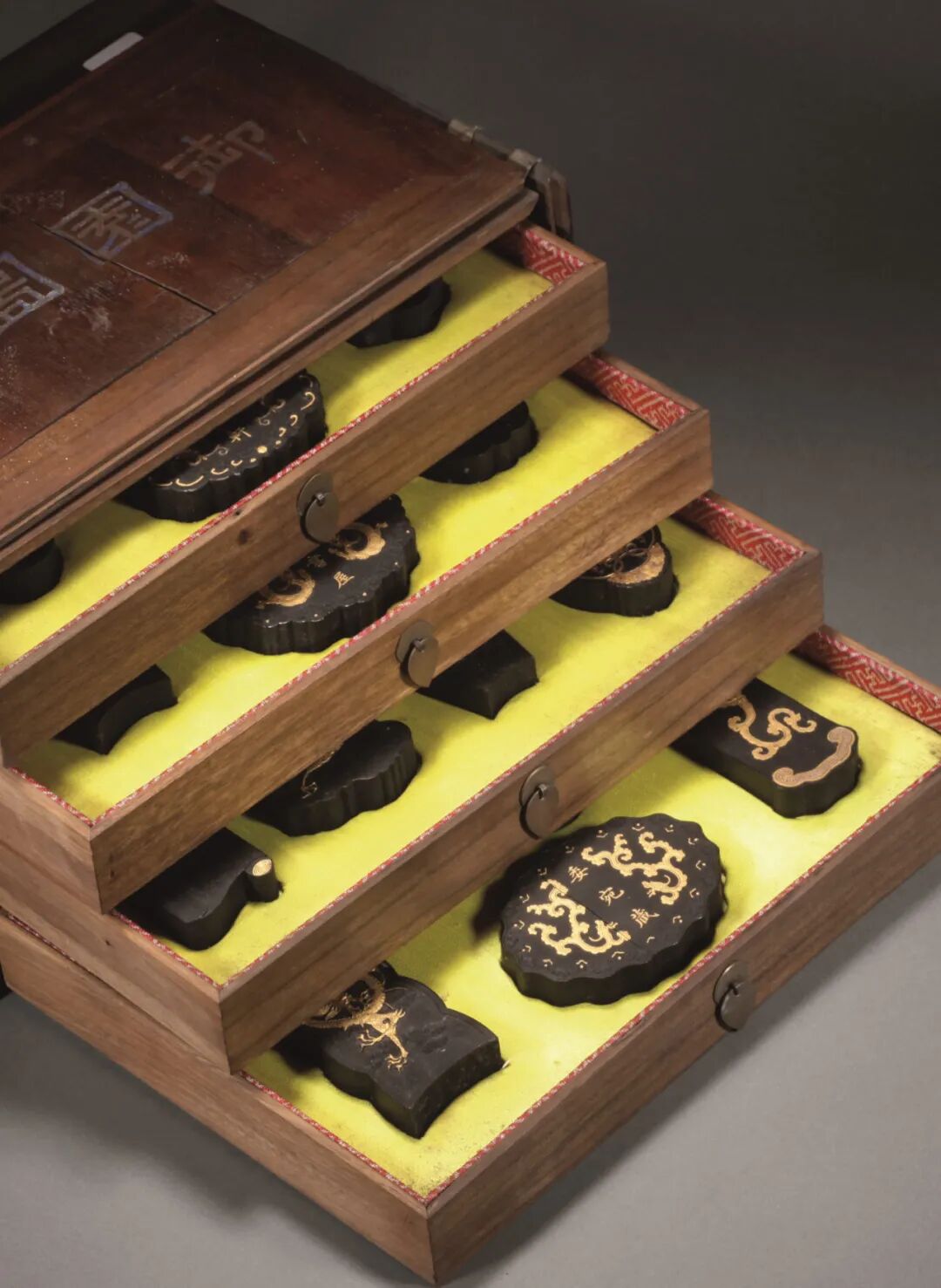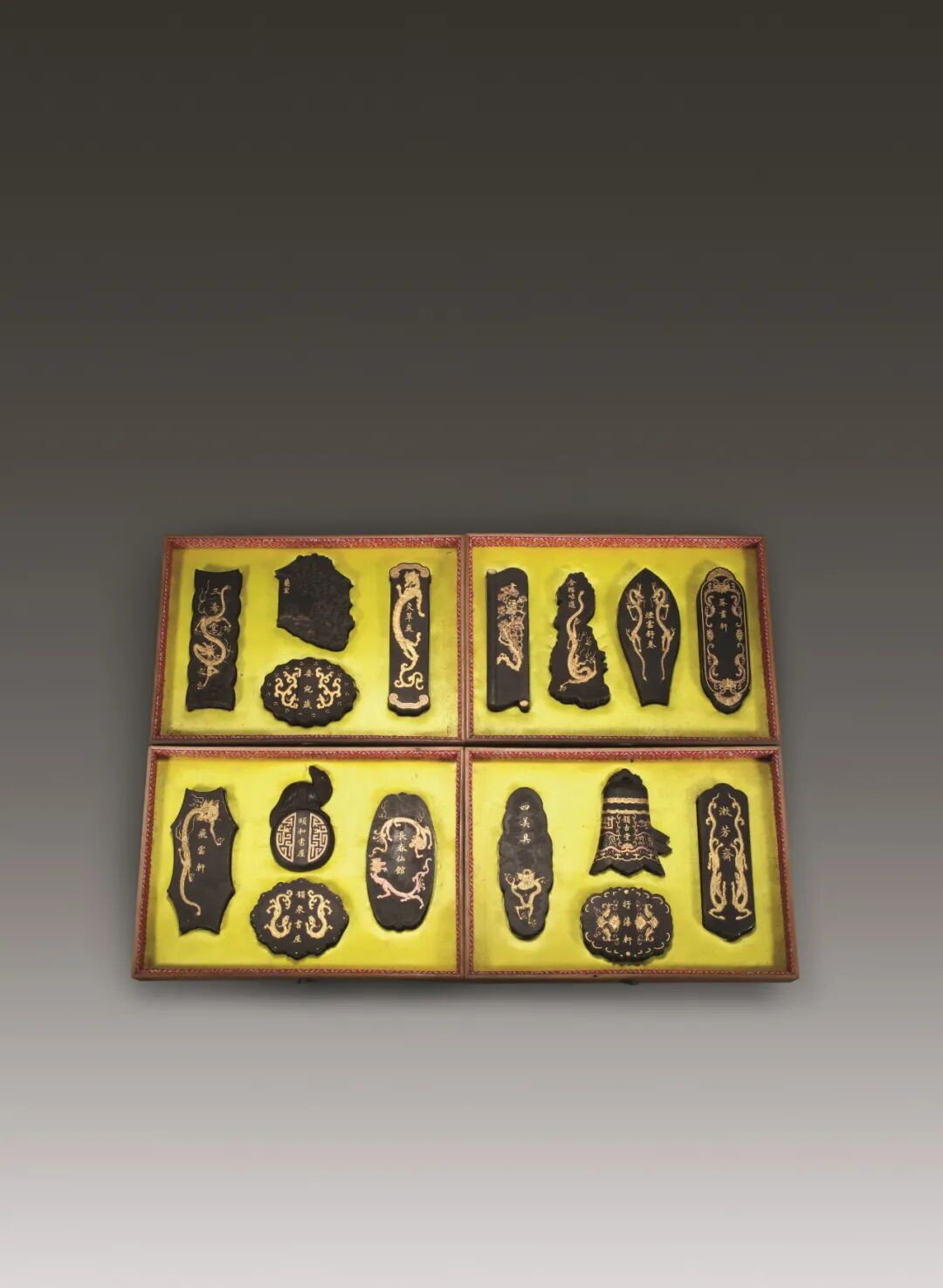 御园图集锦墨选材于北京故宫、西苑、圆明园等名胜景观,以其楼、阁、堂、院、亭、轩、馆、斋等建筑为蓝本,一景一图,造型奇特,形态各异,或形似古琴、钟鼎、书卷、怪兽,事写湖光山色、亭台楼阁,墨面文字填金带彩,正面书写楼阁景观名称,背面绘製亭台全景,侧面阳文“嘉庆年製”。这套集锦墨选料上乘,设计精雅,图样清晰,雕刻细致。配旧提梁木盒,一盒四屉,一屉四墨,锦地硬嵌,包装雅致,极富文人气息,为清代徽墨的代表之作。也是嘉庆年间贡品墨中的上乘佳者。