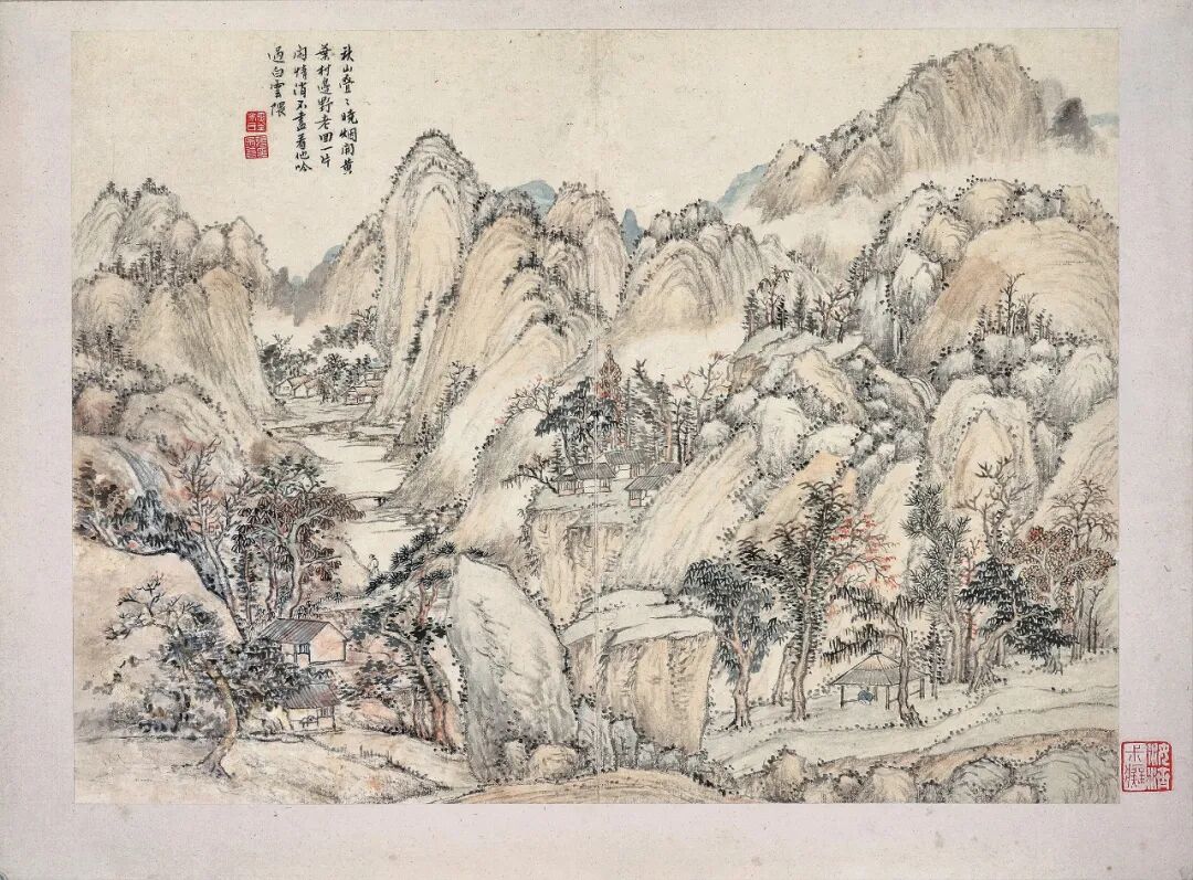 8. 秋山疊疊曉煙開,黃葉村邊野老回。一片閒情消不盡,看他吟過白雲隈。鈐印:「墨岑氏」、「張宗蒼印」