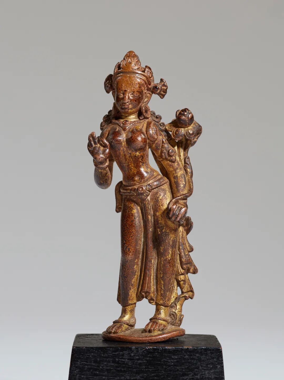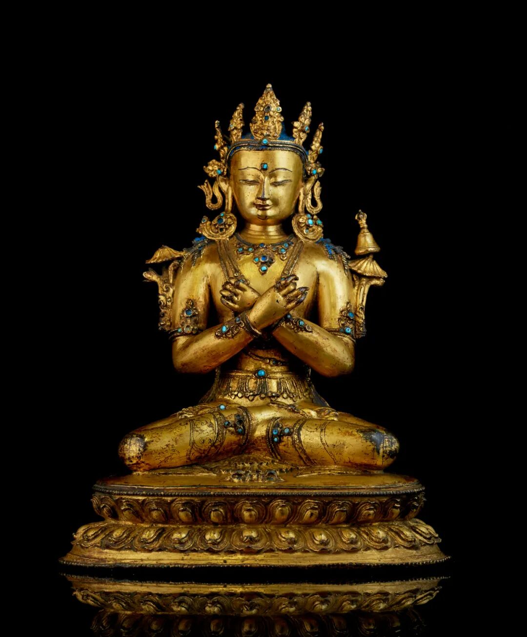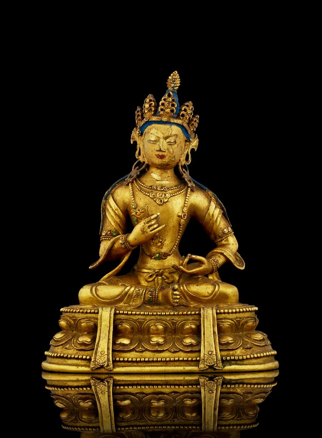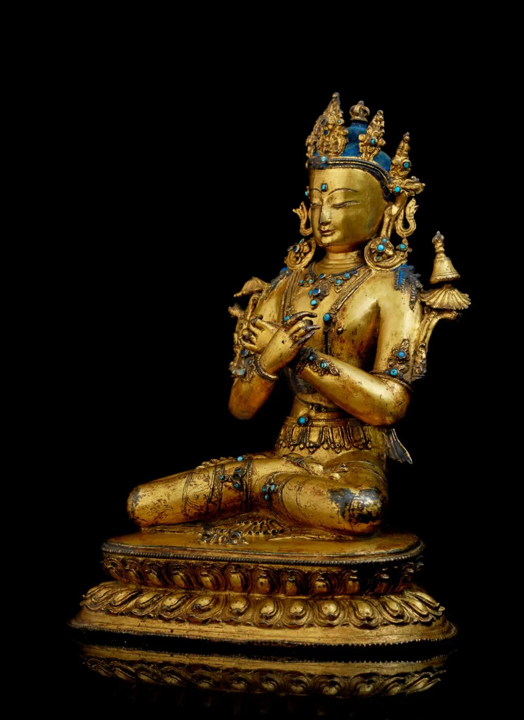 另一方面,铜像带有封底及内部装藏,头发上带有青金石颜料涂绘,所嵌杂宝为绿松石,而非可透光的宝石,皆体现出西藏的宗教传统,表明这尊金刚总持应该为尼泊尔大师为西藏供养人而作。