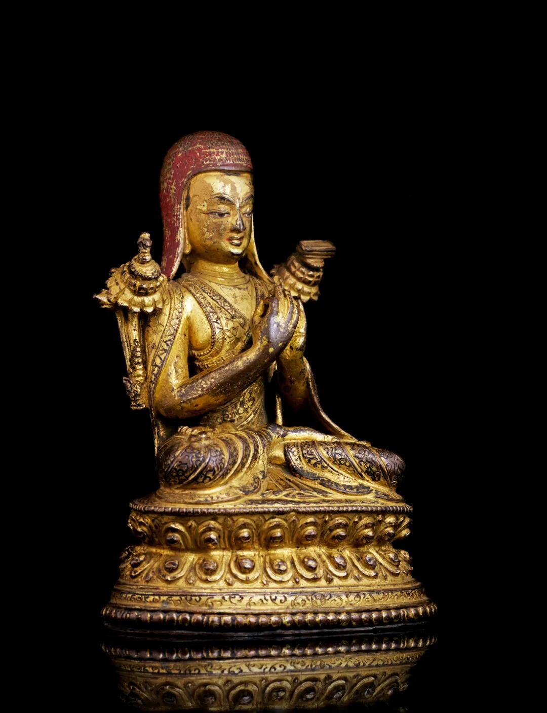 此铜像华美而生动,刻画萨迦五祖之一、伟大的西藏学者与祖师萨迦班智达贡噶坚赞(1182-1251年)。莲座后侧刻有藏文铭文“此萨迦班智达之宝贵造像由嘉措为慈父母造(The precious statue [of] the great Sakya Pa[ita] was commissioned by Gyeltso for the benefit of [his] kind mother and father)”。