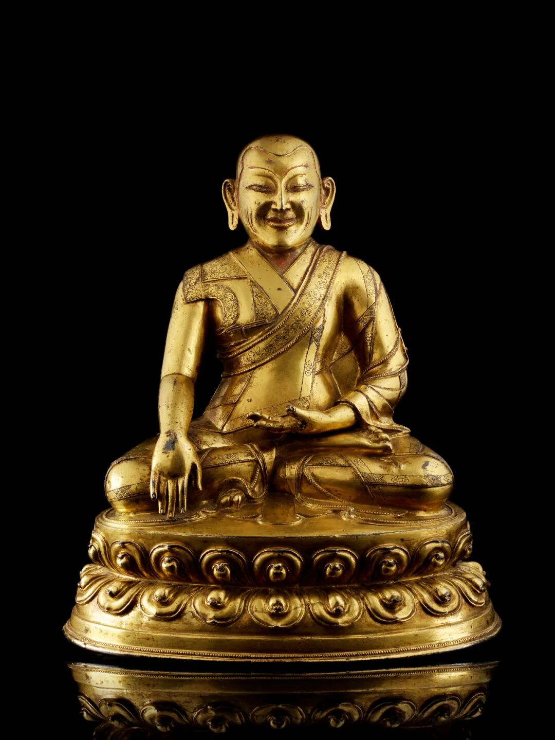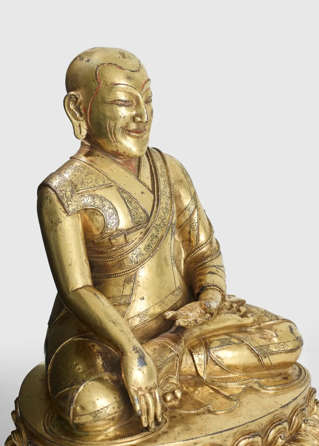 铜像与明初丝织品的一致性以及其精致、明晰的细节塑造,表明其为十五世纪之作,正是被誉为西藏艺术的文艺复兴的时期。其刻画衣物花纹的技法、饱满而圆阔的莲座花瓣、莲座较高的下缘以及封底鎏金、皆与西藏艺术大师索南坚赞之风格一致。索南坚赞曾于1430年左右为至少一座的藏中寺庙制作重要造像,并因一尊壮观的千手观音上所刻铭文而得以认知(邦瀚斯,纽约,2018年3月19日,Lot 3033)。袈裟下缘露出大师的脚趾,这个十分不寻常的细节或许同样表明此铜像出自一位技艺高超、不落窠臼的艺术家之手,他知道如何精妙地为作品增添生机。