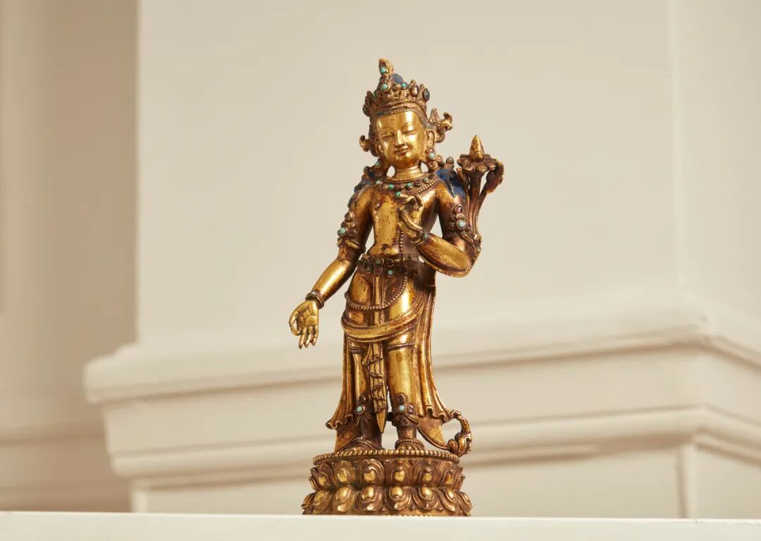 铜像铸造精美,鎏金厚重,莲座风格特征显著,带有长且鼓起的莲瓣以及弯起的尖端。此铜像应属于藏中日喀则地区的扎什伦布寺所造之像(参考罗文华之《扎什伦布造像 须弥福寿因缘》,收录于邦瀚斯,香港,2019年11月26日之拍卖图录)。扎什伦布寺为班禅喇嘛驻锡之地,并被认为是十七至十八世纪之间最具权势及影响力的西藏寺庙。