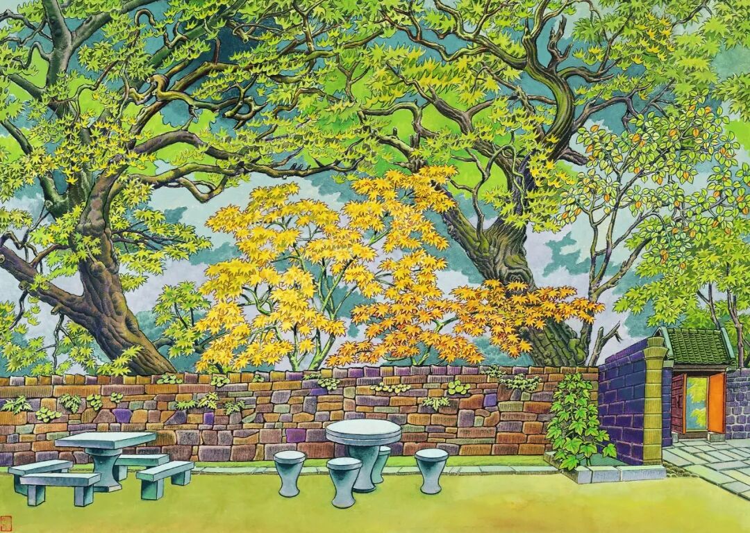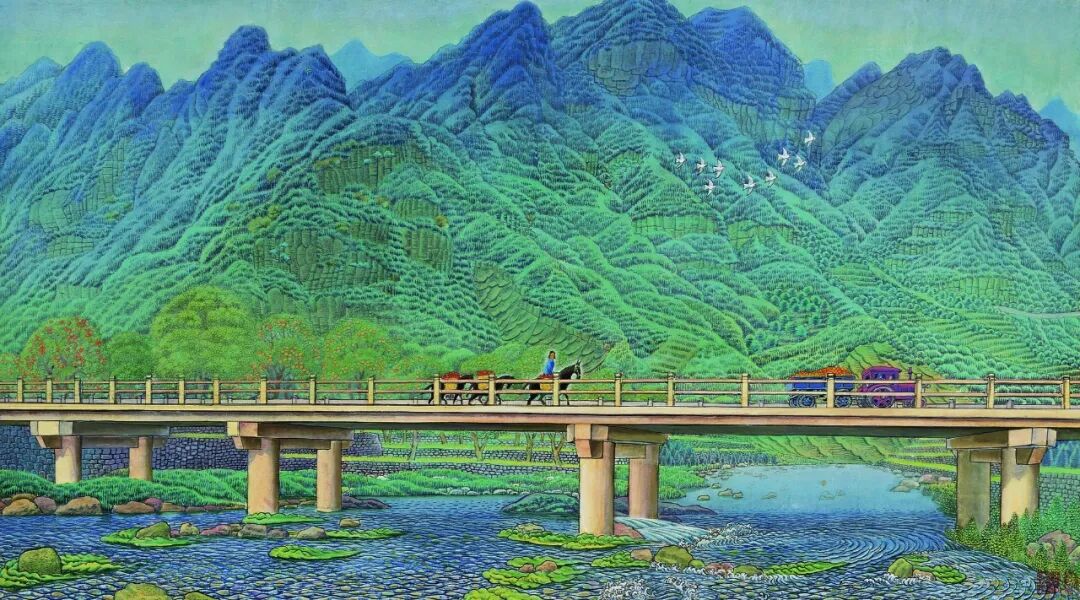 他的作品艺术风格鲜明,表达一种独特的审美,取精微而抒广大,远看有宏伟气势,近看又精致入微。他的重彩画是在写生提炼的基础上,并赋予其对色彩造型意境的追求,以构建成他心目中美好的乌托邦。