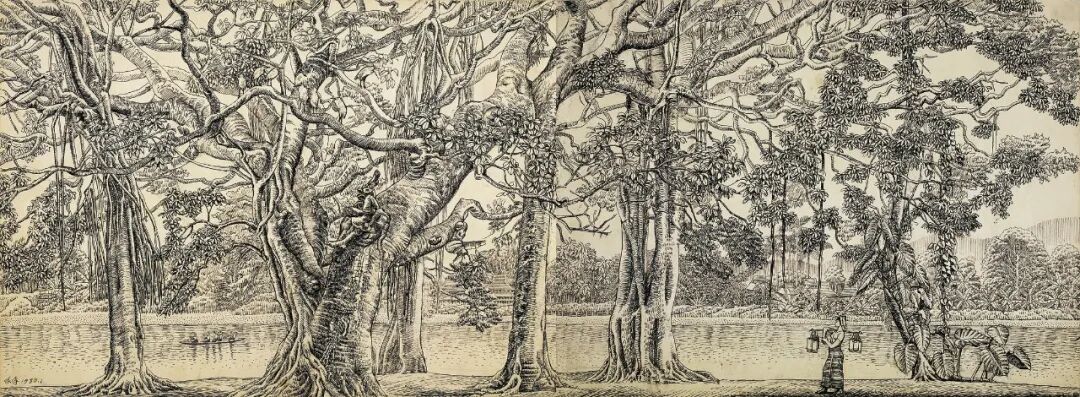 ·《罗梭江畔》钢笔画 39.5×106.5cm1980年