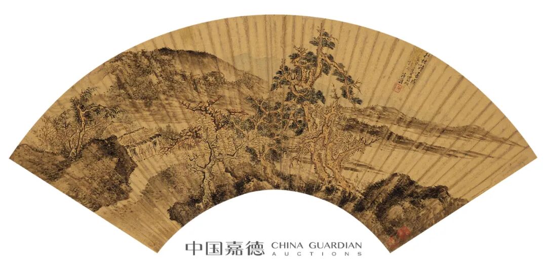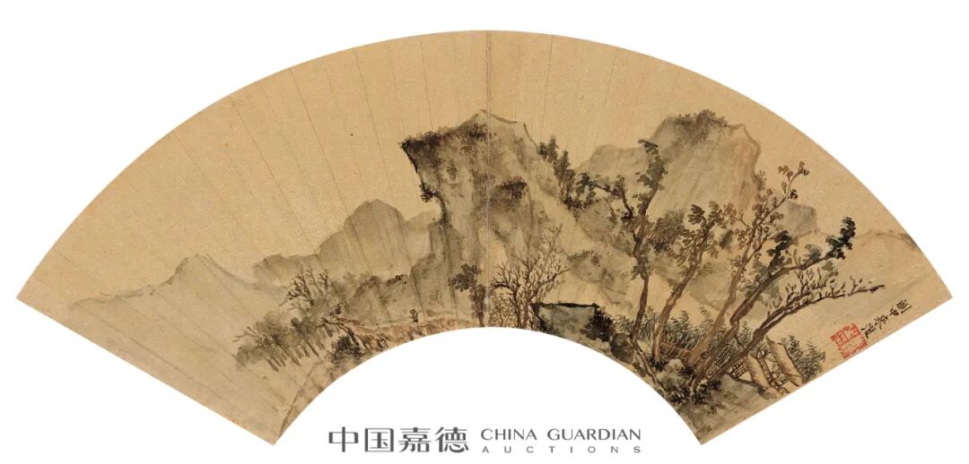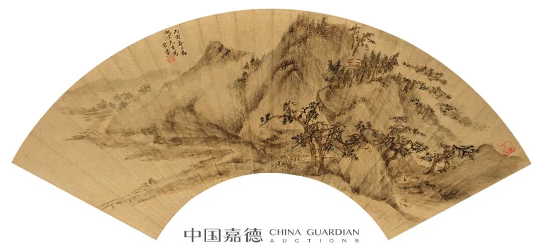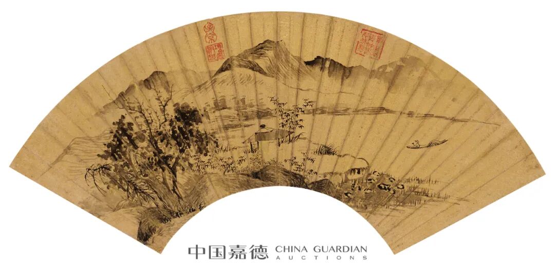 1. 常莹,号珂雪,晚年华亭书画僧,住太仓超果寺。精画理,善山水,宗宋元诸家,笔墨浓润秀逸,与赵左齐名。此扇写重岗叠嶂,云树深处有村舍隐于山谷,楼观高耸于岭表。谷底泉流缓缓汇于江头,大江远处青山如眉,曲径蜿蜒通向远方。画中峰峦峻厚,气象雄浑,景物繁茂而气脉团结,力避赵左、沈士充琐碎之习,是其佳作。