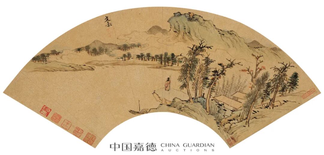 此辑特从嘉树堂藏品中撷取明代中晚期,书画家、官绅、学者红金扇页计十八帧,以吴门画派陈淳《秋江千艇图》、陆治《溪阁泛舟图》、文嘉《待渡图》领衔。此三人皆为吴门俊彦,文徵明之子弟后学,难得于书画创作道路上能各辟路径,故而三幅山水扇页既具画家各自独特风格面目,又统一于吴门典型的雅致赋色之中,加之扇页的红金质地相辉映,自是逸品佳作。