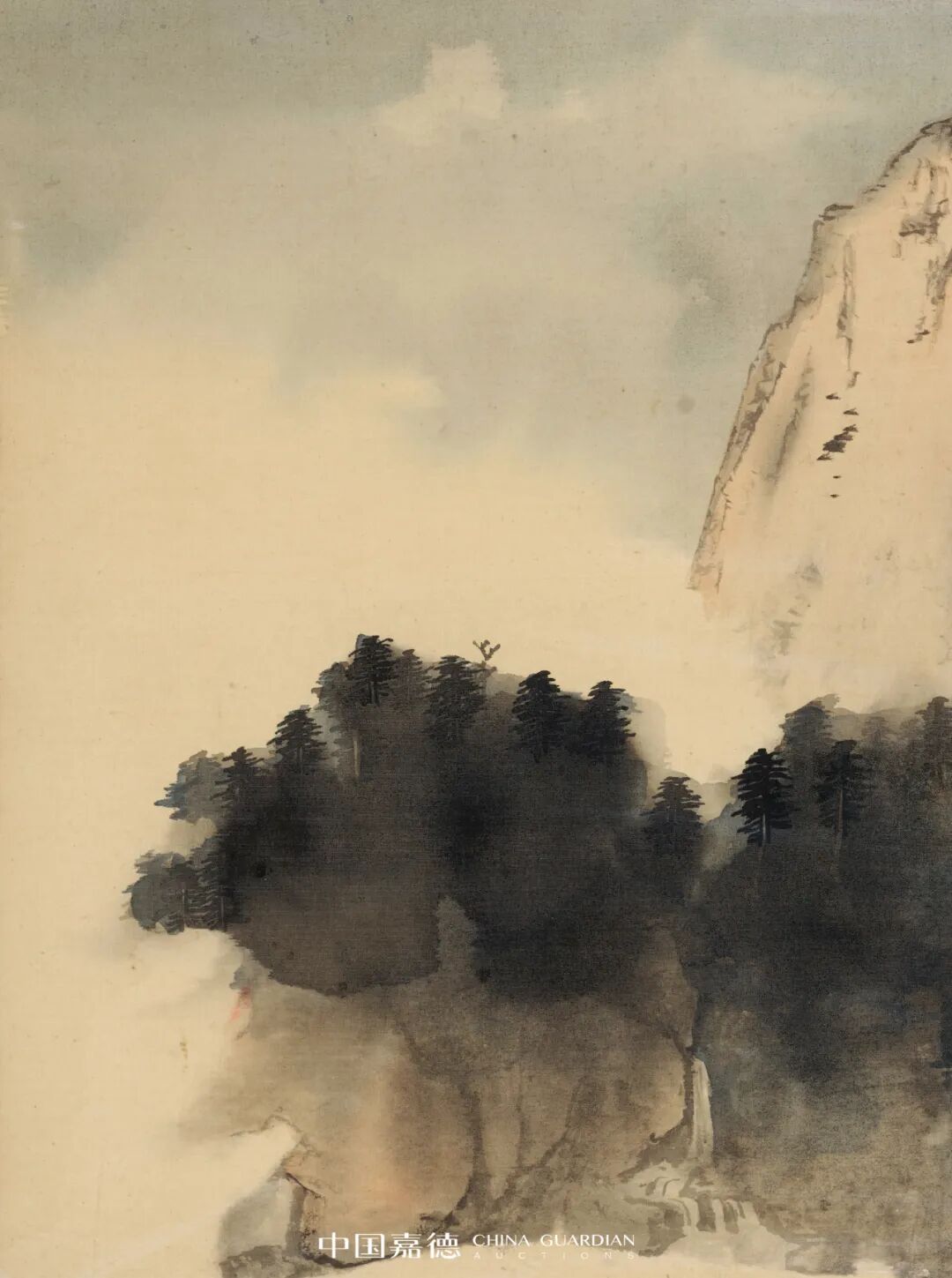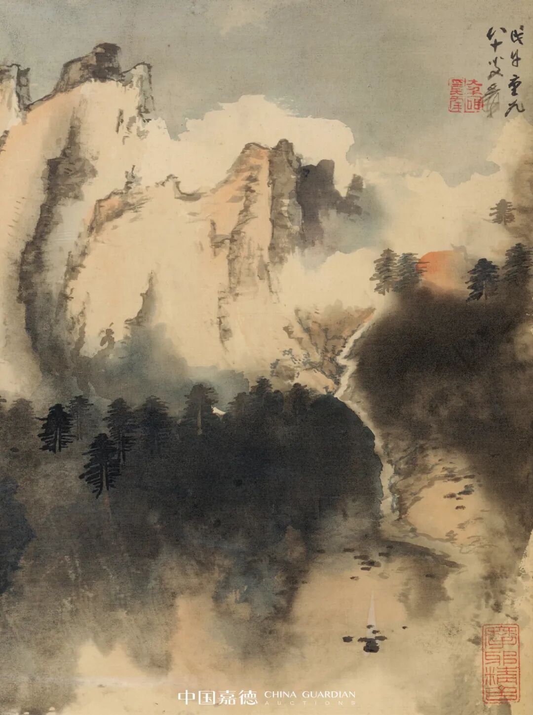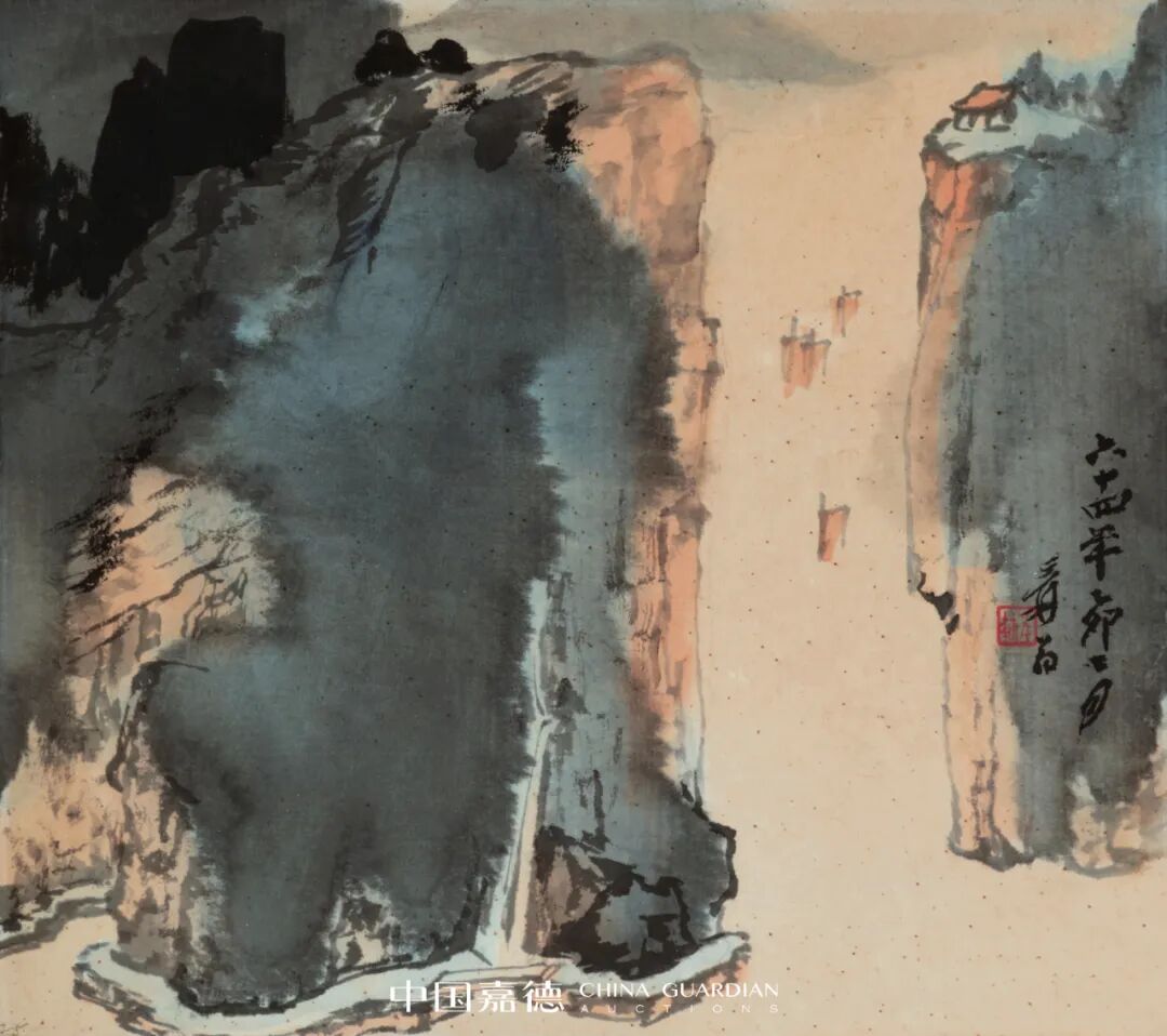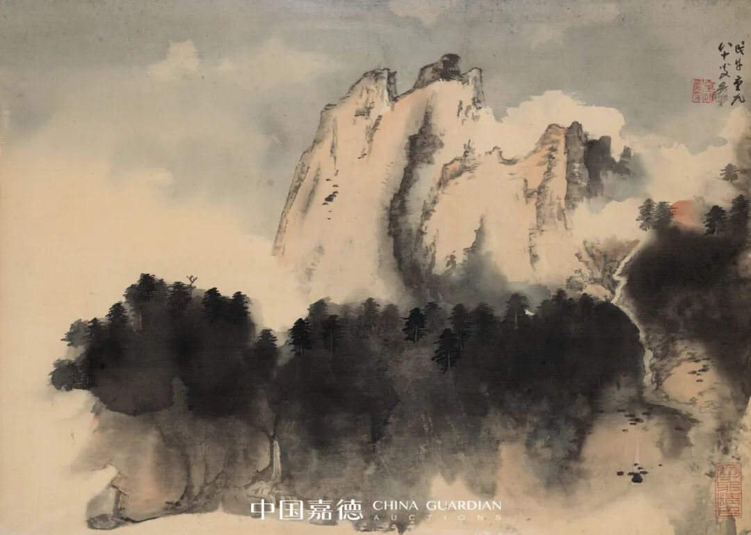 七十年代后期,张大千的泼彩技艺渐入苍深渊穆之境,其传统绘画中的皴法和线条相对减少,而注重于营造画面的意境与气势。是图大千前景用墨湿重,仿佛林木吸饱了山间云露,厚重低垂,随风摇曳,而后用冷静肯定的线条与皴擦刻画出岿然不动山体,动静相合,舒适而自然。画中主峰明亮耸立,宛如犀角,山林之中瀑布倾泻,生气勃勃,云雾中一小路蜿蜒而上,直通过峰顶。右侧一抹朱红仿佛初升旭日,又似流光霞彩,山间朝暮,晦明变幻,给予人无限遐想,正是泼彩画之独有魅力。