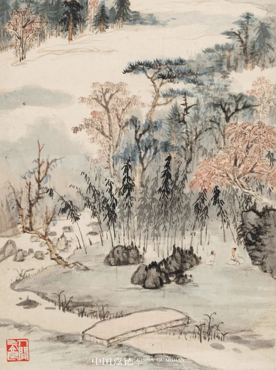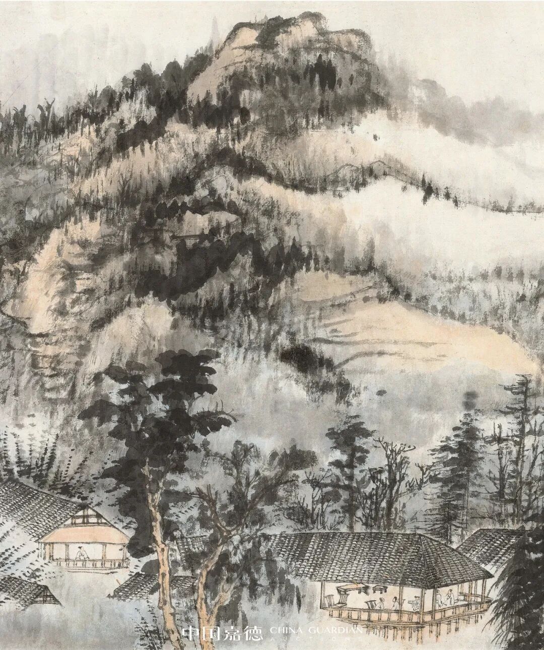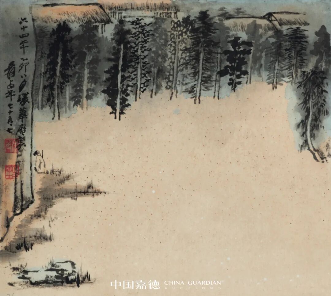 甲戌1934年,大千在苏州网师园内蘧园,忆去年旧景,绘《罗浮宝积寺》。同年还有《宝积寺忆旧》、《罗浮梦题》之作,题:去年十月,与三姪心铭入罗浮数过梅花村,问麻姑买酒,回不得。漫赋纪句。又:“罗浮旧梦最销魂,劫后梅花尚有村。”大千取法石溪,以苍茫拙厚的秃笔法做皴点,设色上使用较多赭石、花青等色调,用花青渲染林木,画面气氛在暖调子中不乏清冷的逸趣。大千的山水画从石涛入手而上溯宋元,又素喜多方涉猎,虽石溪画风所为不多,然偶一出手就不同反响,把石溪画风演绎得丝丝入扣又不着痕迹。画面采取高远和深远视角构图。设色清秀。以云雾三十年代,张氏兄弟与叶恭绰、王秋斋在苏州网师园合影 隔其间,看似写生,实则是对理想山水的写照。Lot 381