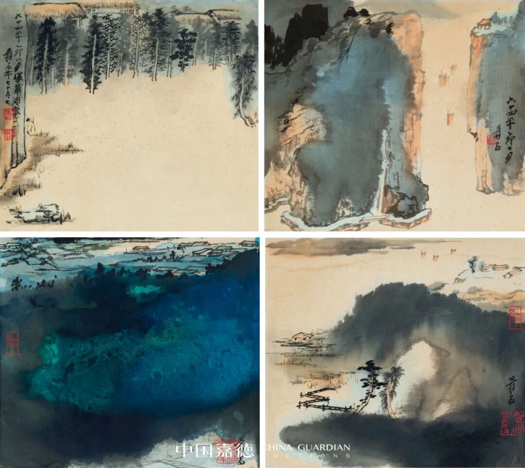 从四帧山水可见,大千在探索泼墨泼彩的同时,并没有舍弃传统的写意手法。《张大千画语录》中述,所谓山水,就是西画及摄影的风景。国画中山水的境界最为重要,然而也要笔墨来辅助。有了境界,但是没有笔墨,或者有了笔墨,但是没有境界,也就不成为名画。