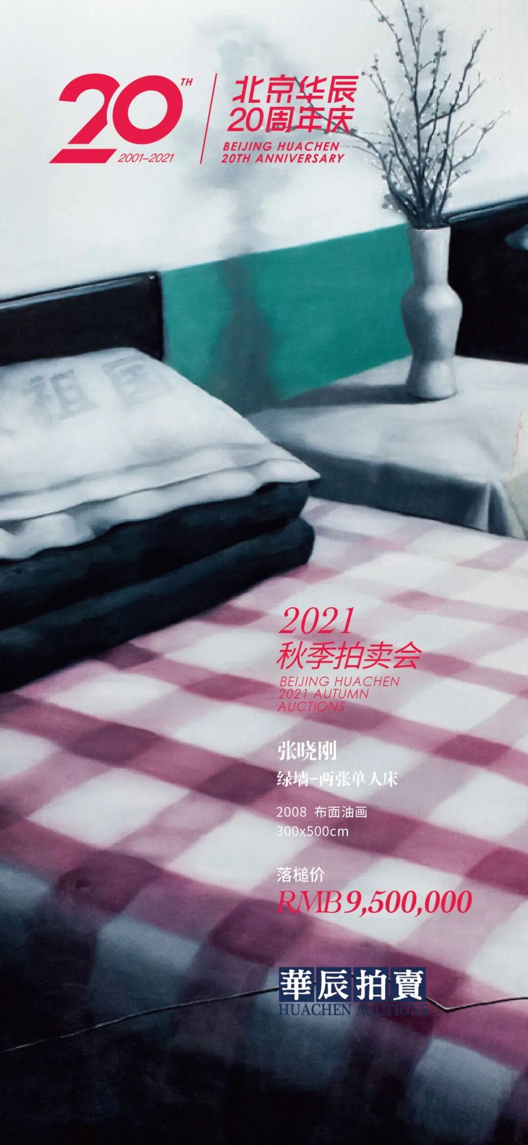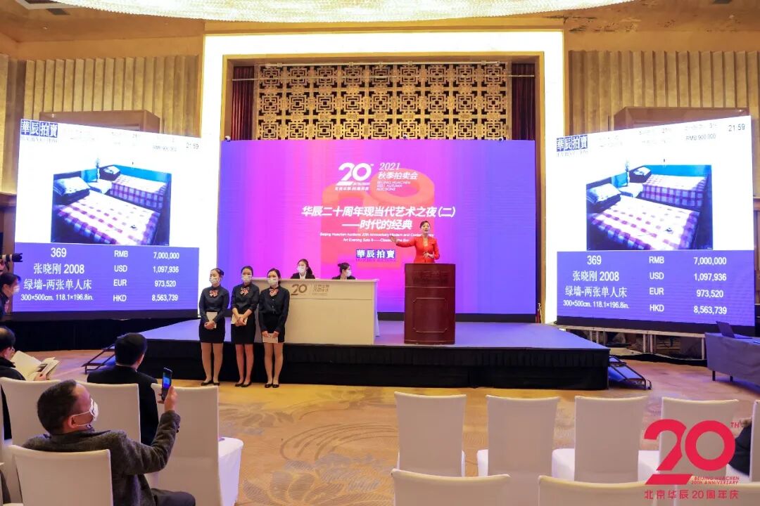2021年对于华辰拍卖来说是一个颇有纪念意义的时刻,正值华辰拍卖成立20周年之际,华辰拍卖推出了当代艺术夜场的豪华阵容,“致敬中国画廊业30年”为主题的现当代艺术之夜(一)和以“时代的经典”为题的现当代艺术之夜(二),以致敬中国画廊三十周年及北京画廊协会成立十周年。回顾华辰20周年的发展,甘学军谈到,华辰二十年有一点是不变的,那就是要守正和变革。北京华辰拍卖现当代艺术夜场拍卖共成交50件拍品、一件破千万,15件超百万元成交。其中张晓刚《绿墙-两张单人床》最为引人瞩目,有七个出版三个展览,以500万元起拍、950万元落槌,由现场买家竞得。