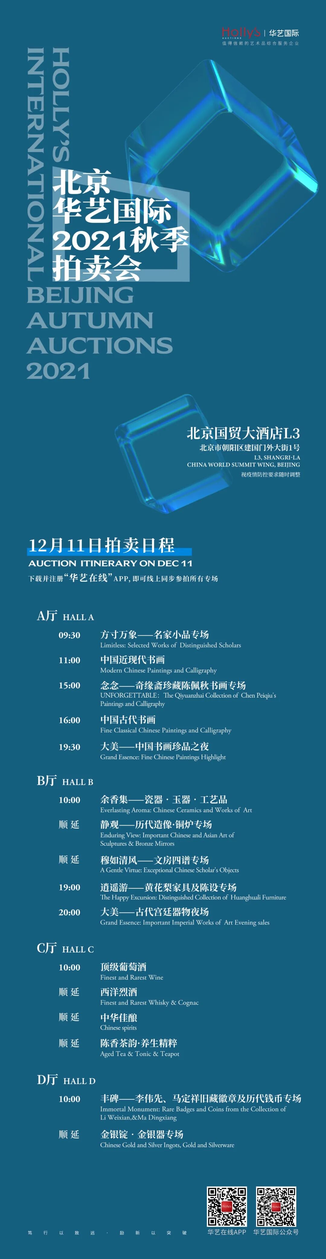 12月11日,中国书画、瓷器·玉器·工艺品、名酿·陈茶·养生、邮品钱币四大版块,依次举槌,敬请期待。拍卖日程安排详情如下,点击图片可查阅“华艺在线”同步拍电子图录,参与网络竞拍。