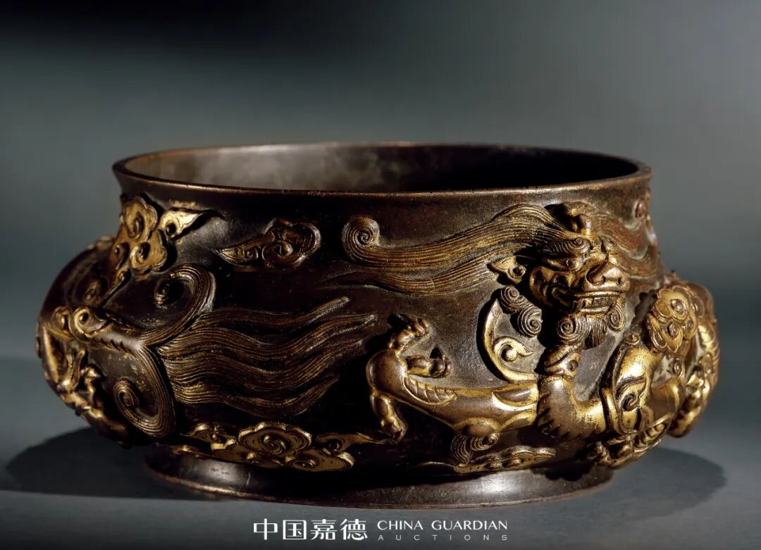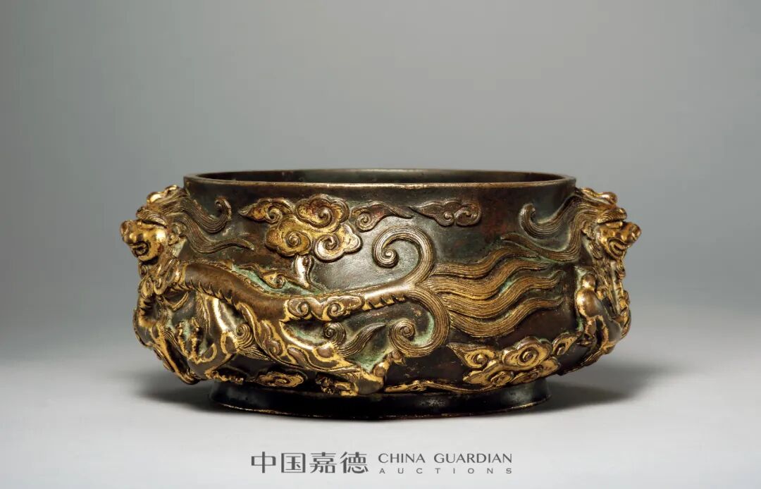 明代因宣德炉的产生,营造出古代中国铜器艺术的又一高峰,红袖添香伴读书成为文人向往之风雅。久负盛名的宣德彝器以优美简雅、皮色多样影响后世,但明代宫廷官方亦有金碧辉煌华丽养眼的重器制造,或雄浑壮硕,或细腻温雅,成为与宣炉并行发展的另一种审美。来源:Luisa Feltrinelli Doria旧藏,编号242V此件香炉作簋式,规整周正,炉身通体高浮雕双龙穿梭云雾之间,双龙首高浮各据一方,亦作炉耳,别具巧思。行龙云间穿梭,云雾卷曲缭绕,龙身形如流水,极具动感,仿见游龙腾跃之姿,须发交代毫不含糊,其铸造之精细,处处彰显内府良匠状物之能事。炉底部平整,中央开框“大明宣德年制”六字楷书款,款字清晰利落,官气十足,铸后直接斜刀将字口处铲平,以追摹晚明所盛行的碑帖之风,六字不计工拙,仪轨森然,似拙实巧,也可读出造款者匠心独具,为典型明代款式。此炉云龙纹鎏金,金水灿烂夺目。內膛处理工谨,显旋纹痕迹,铜绿斑驳,拙意顿生,与外壁富丽堂皇的鎏金色泽相映成趣。铜质精良,以指轻叩,嘤嘤之声不绝于耳,重心集中于下半部,入手生坠,亦为典型明炉风格。此炉问鼎三绝,实乃明炉另辟蹊径之佳器,予人耳目一新之感,传世无多,极为珍贵!