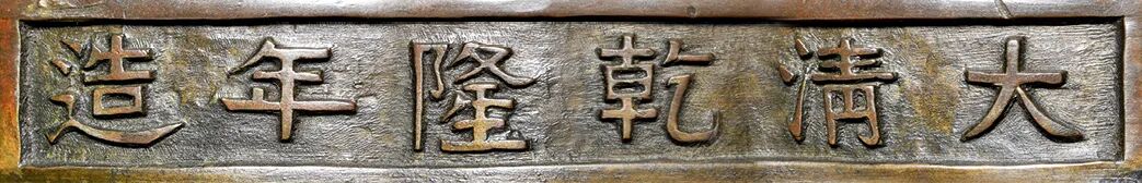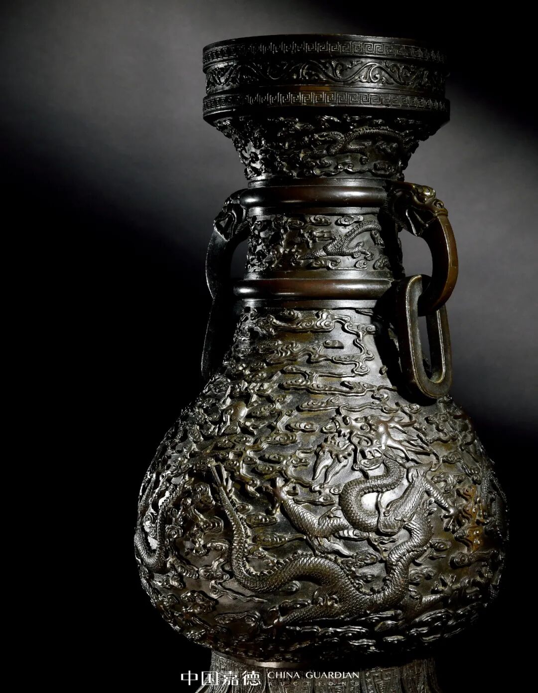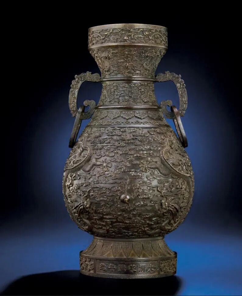 乾隆皇帝对于宫廷用器,向来要求严苛,制作不惜工本,力求精益求精。专场中一件“清乾隆 铜浮雕云龙纹兽耳衔环瓶”即属乾隆宫廷仿古铜器的杰作,其显着特点在于追求精致和恢宏的气势,师古而不泥古。1.香港佳士得,2012年11月28日,Lot22542.MARCHANT EST1925 Imperial Chinese Porcelain Ceramcs & Works of Art,编号50本品体量硕大,以精铜为材,皮色于栗枣间,铸造精良。盘口及足墙饰卷草纹,颈部装饰两组行龙纹,腹部装饰二龙戏珠纹,纹饰高耸,铸造精细,龙身须发、鳞甲无不精细,胫部饰变形莲瓣纹。足墙正面铸刻“大清乾隆年造”六字单行楷书款。本品从器型到纹饰均极力追慕上古遗风,这是乾隆朝国力鼎盛在艺术上的体现。乾隆时期的铸铜工艺繁复纤细、毫发必现,所铸器物精致而细腻,本品即是其时的代表作之一,为重要陈设礼器。从其铜质的精良、严谨的制作工艺以及五爪龙纹特征上无不显示出宫廷铜作的特点。值得注意的是,本品应属乾隆时期宫廷供器,现故宫博物院慈宁宫的咸若馆即有陈设此式铜瓶。慈宁宫是昔日清代后妃礼佛、祭祀先皇之所,亦可映证其供器功用。与本品造型、纹饰相类者,还可见一式无款者,纹饰布局基本相同,唯耳部装饰为如意耳。二者功用亦应相同,此类是否属款,当严格按照内廷要求而铸。香港拍卖会,2012年11月28日,Lot 2254类例可见美国收藏家 F. Gordon Morrill 旧藏一例,造型、纹饰均与本品相类,释出于香港拍卖会2012年11月28日,Lot 2254。![]()