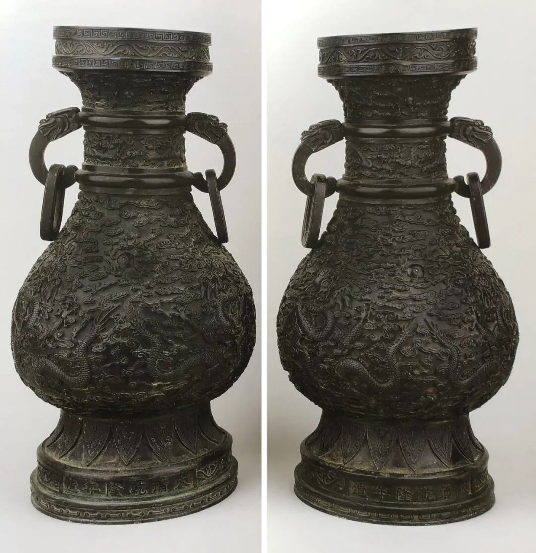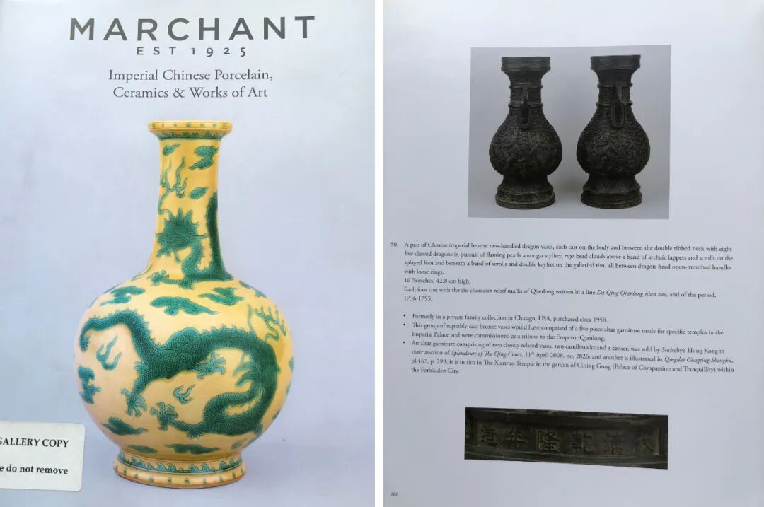 另有,《MARCHANT EST1925 Imperial Chinese Porcelain Ceramics & Works of Art》一书中著录有一对同类铜瓶,其造型、纹饰、尺寸等与本品如出一辙,几乎一样,可兹比较。
