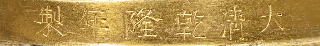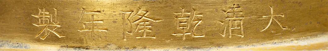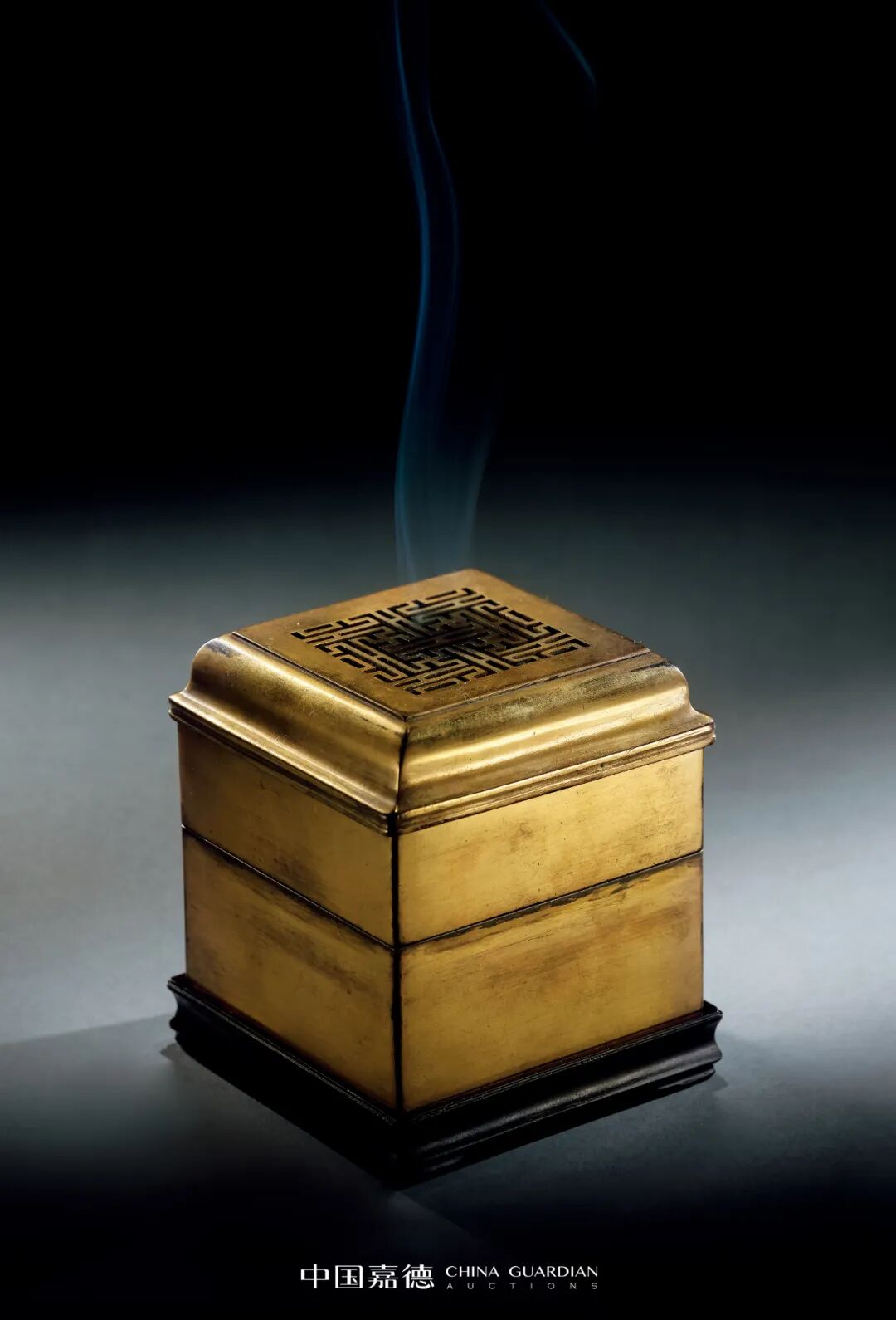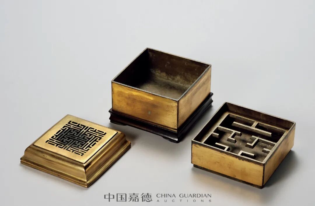 以炉熏香是我国古代生活中仿制礼用,伴读琴书的一种意趣,连帝王们都参与其中。在宫廷陈设中,熏炉在帝王们的文房案头中常伴之,传至后世融入更加丰富的装饰因素,使其不仅愈加美观,也逐渐跳出实用器之范畴,更趋于观赏性。H 8.7 cm,H 10 cm(含座),W 773.5 g展览:“食后 : 牧心斋古代香、茶具展”,嘉德艺术中心,北京2018年本品熏炉端正大方,呈方形,形似家具中的方形官皮箱。整器精铜铸造,铜质精良,入手厚重。熏炉两幢,内有子母口可与炉身相扣合。熏盖盝顶较矮而方正,甚为考究,镂空雕刻有“工”字纹,图案布局规整,工艺精湛。既美观又有利于熏烟出溢。两层隔层可分别取下,宜于置物。炉内附件完整,有 “工”字纹香槽架,便于焚香整理。底置紫檀方形器座,更衬拖方熏气质之美。熏炉形制简约规整,铸造精良,鎏金精美,品相完好,典雅大气,为乾隆时期文房雅玩工艺之极至。器底中心刻方框“乾隆年制”四字二行楷书款,布局舒朗有致,结字方正规矩,微见伶俐刀痕,为典型的乾隆时期御制款体。此件方熏胎体厚重,鎏金锃亮,特殊之处就在于器身的满鎏金,再加上特殊的款识款体。此款体只在御制的铜胎画珐琅器和掐丝珐琅器上常见,在铜鎏金器上极少见。可想此器应为皇帝下旨承造,更是供皇帝本人使用及观赏用物。方熏精工巧制,隽美周正,炉内焚香,烟渺缓然升空,每个局部、细节均有可赏可品之处,华丽精美,熠熠生辉。古人多用香熏在室内熏香净化空气,或熏衣被而保持香气,所谓“燎熏炉兮炳明烛,酌桂酒兮扬清曲。”若置此器方熏,幽窗破寂,与友品茗论道,畅神怡情,穿越古今,是为佳话。
