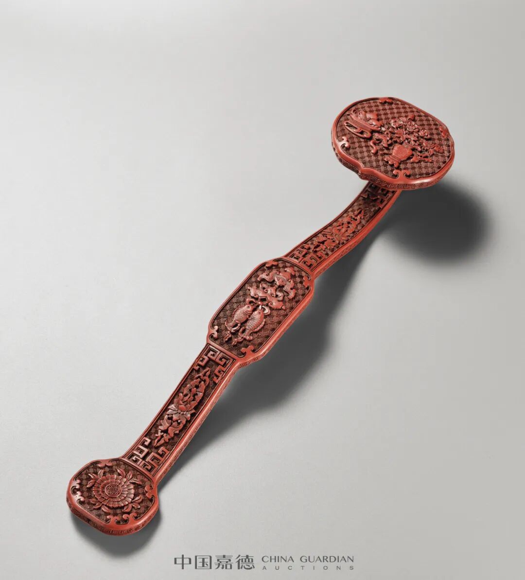 有清一代,如意备受皇家推崇,是地方官员朝贡的重要品种,凡皇帝登基、大婚、元旦、万寿等节庆之日,精粹华美的如意纷纷被贡入皇宫,清人姚之元在《竹叶亭杂记》里记述:“年节王大臣呈进如意,取兆吉祥之义也。自雍正年间举行,嘉庆元年,贝勒、贝子公等,以至部院、侍郎、散秩大臣、副督统,俱纷纷呈进两份”。此柄“清乾隆 剔红博古图如意”即为其中一例,呈现出清乾隆漆雕华丽精巧的典型风格。本品造型规矩典雅,落落大方。漆色红润纯正,雕工娴熟,刀工细腻,运刀如笔,时代特征鲜明。与其它艺术门类一样,剔红雕漆工艺发展到清代乾隆年间可谓工艺史上之集大成,形成了气质典雅,雍容华贵,精益求精整体时代风格。此柄如意为典型的宫廷作风,从漆质、工艺、风格等方面考证,应为乾隆时期内务府造办处漆作的精心之作,其布局装饰严谨,完全符合当时宫廷艺术的法度,殊为难得,是不可多见的宫廷珍品。