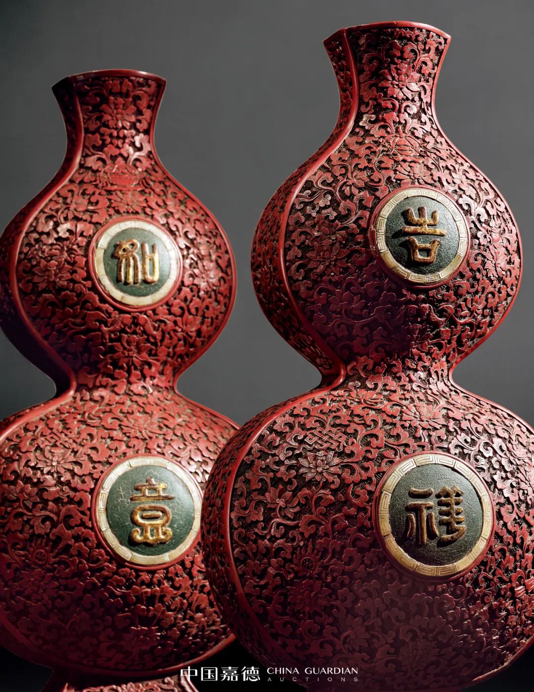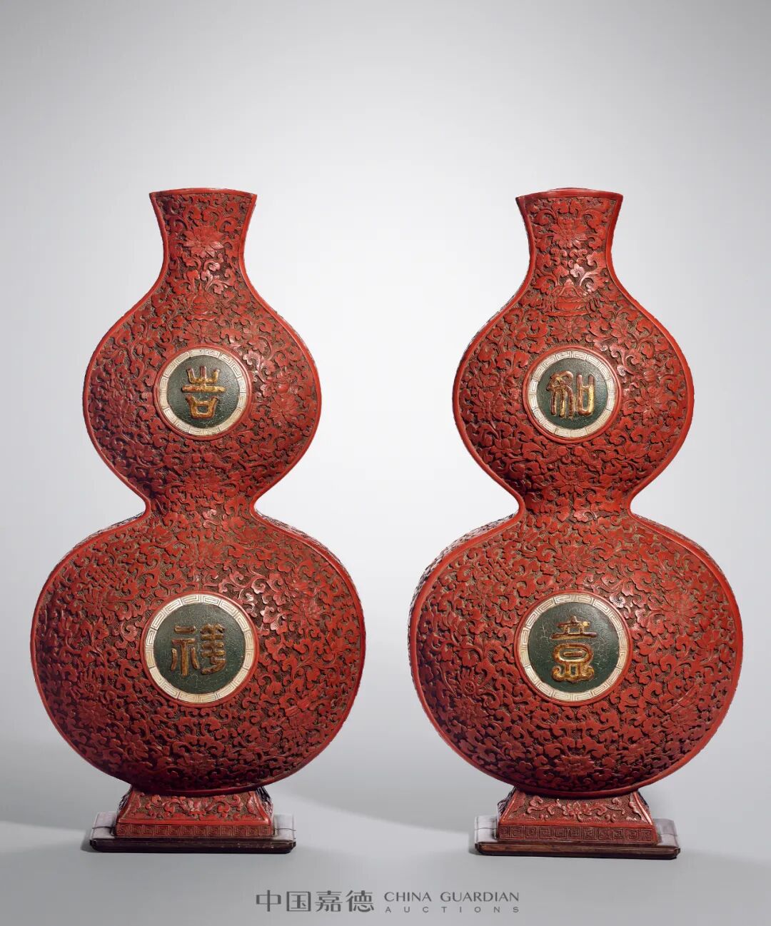 乾隆一朝持续六十载,盖中国历史上屈指可数的盛世王朝,文化艺术可谓遍地开花,呈现出百花争艳的形势。清宫养心殿造办处承制了大量雕漆名品,无论是整体技术水准,还是艺术风格都趋向顶峰,具有气势磅礴、优雅高贵、择料精良、造型成熟、工艺精湛、纹样华美之大家气魄。此对“清乾隆剔红缠枝莲托八宝‘吉祥如意’葫芦瓶”,即为这个时代最有力的见证。1. 英 国 亚 姆 顿 凯 特 利 大 宅 第 五 代 奥 克 兰 勋 爵William Morton Eden(1859-1917)(标签);3. 伦敦邦瀚斯,2020年11月5日,Lot 0106。本品造型扁葫芦状,造型稳重大气,通体髹朱漆,瓶身剔刻连续菱花锦纹为地,其上剔刻缠枝莲托八宝纹图案,饰纹样繁缛纤巧,并多与其他工艺相结合,营造出一种富贵堂皇之感。以八宝纹和莲花相配合作为纹饰图案,具有浓厚的宗教色彩。满清皇室尊崇藏传佛教,其中以乾隆皇帝最为笃信,弘历一生以佛心天子自称,虔诚而执着地礼佛敬佛,他在紫禁城、各处行宫,建造了许多的佛堂楼阁和供佛寺庙,与藏传佛教相关的各式器物和纹样亦在清宫盛行。此拍品具有典型的乾隆朝时期诸多特征,雕工锋芒毕露,细致缜密,通过多层次的雕法和开光的设置提升了构图的立体感,动感,和震撼力,使人赏心悦目,如同置身画内。葫芦瓶上下两部分中心各饰一个圆形开光,其内镶嵌螺钿回纹一圈,内髹黑漆,上分别“吉祥”“如意”二字,寓意美好。葫芦与“福禄”谐音,且器形像“吉”字,故又名“大吉瓶”,寓意“大吉大利”。器底原配硬木方座,边沿起线,更显宫廷造器的典雅感,必是当年清宫造办处为装饰宫廷一角而精心制作。整器富丽端庄,大方得体,是乾隆朝民生富贵,家资充裕,渴望长久吉祥的充分体现。