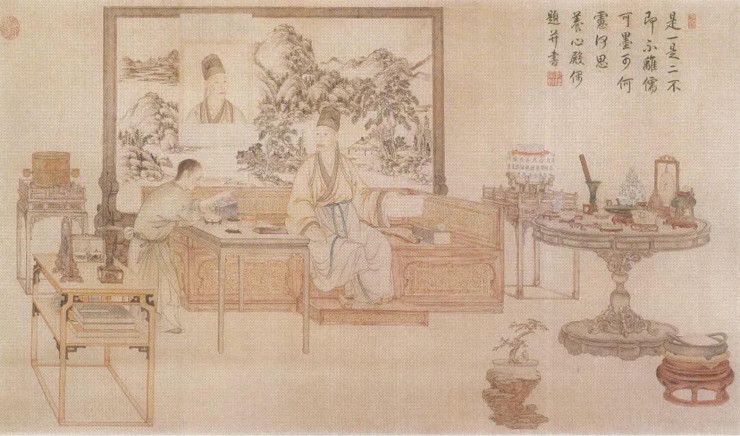 明清两朝,宫廷是帝王居住和处理朝政的处所。传统的宫廷器物要求体现皇家贵族的威严和神圣,所有宫廷内外的艺术家共同参与设计制造,甚至皇帝也亲自参与设计,表现出皇家审美趣味上的追求。皇家思想至高无上,传达出帝王是天地间至尊至贵的文化信息,具有一定的神圣性。故宫博物院藏清乾隆宫廷画师丁观鹏绘《弘历鉴古图》就将帝王宫廷生活中对器物的审美意趣表现的淋漓尽致。