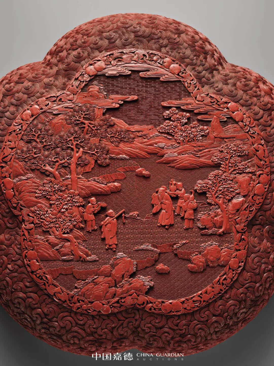雕漆是把天然漆料在胎上涂抹出一定厚度,再用刀在堆起的平面漆胎上雕刻花纹的技法,成熟于宋元时期,发展于明清两代。尤其乾隆朝,由于国力强盛和乾隆帝的积极推动,清代漆器制作到达一个鼎盛时期,此件“清乾隆 剔红八仙故事图梅花式捧盒”即为其中代表。史载乾隆三十六年至四十年左右,宫廷密集制作了各式雕漆宝盒,做工严谨,细巧工整,开创出华丽精巧的典型风格,影响深远。参阅:《和光剔彩·故宫藏漆》国立故宫博物院出版,页121,图109。此件剔红梅花式捧盒造型新颖,工艺精湛细雅之极,外壁通体以剔红工艺装饰,盖顶随形福寿纹边饰开光,内剔雕八仙人物故事图,盒壁满雕水面波浪涌起,刀法利落干脆,纹饰精致华丽,为典型的宫廷制作手法。整器髹漆厚重,漆色红艳,漆质坚脆,雕工精细奇巧,构图繁缛而颇具法度,巧夺天工,纹饰图案高雅清新,富有超凡脱俗的意境,精美绝伦,是一件代表清乾隆时期剔红典型风格的作品,且集“海水纹”及“八仙祝寿”两种题材为一体,表现了制作者精妙的构思设计和高超的技艺水平。故宫博物院藏有一清代剔红梅花形盖盒雕漆器,与本器造型相似,工艺相近,可资对比。