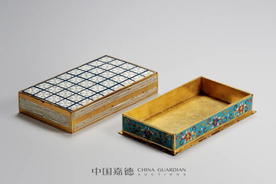 以书函式为蓝本设计成的文具匣是清乾隆时期的宫中文房陈设用匣的独有特色。乾隆皇帝好古,喜爱文化是清代几位帝王中的佼佼者,这可从遗下的大量御题诗,文物收藏和他对其收藏品的包装要求,以及宫中各处的精善陈设中窥探出来。此件“清乾隆 铜胎掐丝珐琅书形盖盒”正是其中一实例。来源:英国著名中国艺术品商Roger Keverne旧藏本品由宫廷造办处制作,器体以书册盒为形,天盖地式,乍看疑似某文仕准备携带出门用书,实际上它是一件铜胎掐丝珐琅制作而成的盖盒,匠心独运,庄重典雅,书册式盖盒则近似填满了书本,工艺技法纯熟高明,颜色明丽,造型生动,文气十足,极为雅致。此盒有着似书非书,非盒是盒的设计,是乾隆皇帝把老庄及孔孟的“似是而非”这种哲学概念融汇在实物当中,令他的起居空间每处都蕴藏着先贤的哲学思想。此盒构思巧妙,色彩艳而不俗,是这件作品的显著特点。类似此类宫廷书形盖盒,在清代宫廷特别是乾隆时期非常典型样式,并有多种材质形式,如瓷器、剔红、木器等等。据记载书函式的器物大多是皇帝下旨承造,更是供皇帝本人使用及观赏用物,处处体现著皇权至上的设计主旨。乾隆时期,艺术工匠们经过独具匠心的艺术创新,巧妙地利用各种色彩、装潢材料和工艺技术,创造了富于庙堂特色的包装风格,与其它宫庭陈设相比,有着大不同的意义。书函式文具匣在宫中其基本用途是收藏皇帝喜爱的东西。包括大小件古玩、书册、诗册及文房用品等等,全是皇帝把玩及使用的器物,由此可见这类文具匣的重要性。此件书形盖盒具备掐丝珐琅这种费时费工的珍贵工艺,雍乾钟爱的设计样式,蕴含着先贤的哲学思想,曾收藏过皇帝的器物,其艺术及收藏价值是毋庸置疑的。