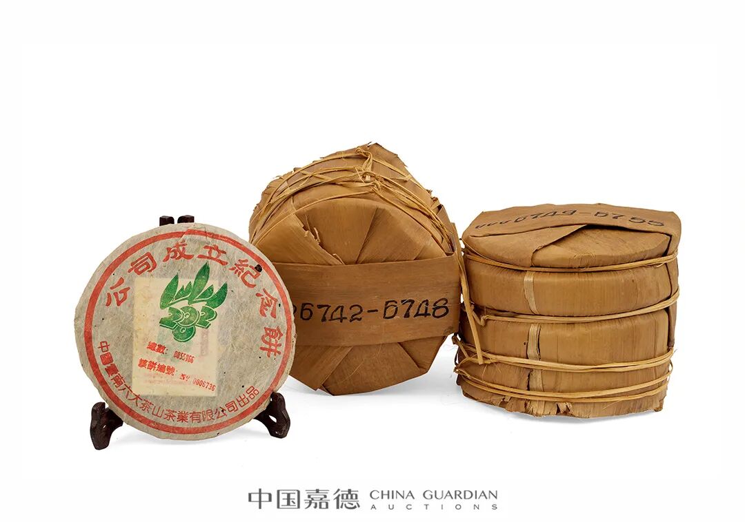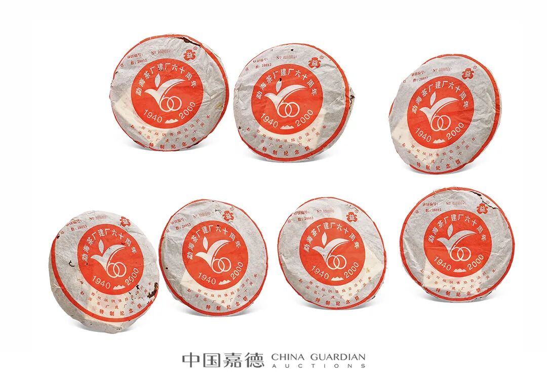 2000年正值勐海茶厂建厂60周年,由阮殿蓉女士参与制作的60周年纪念饼开启了纪念饼的先河,是纪念意义与品饮价值并存的一款茶。这款茶共制作10吨,是世界上第一片有编号的普洱茶,从茶叶的内飞、收藏证明、棉纸、笋壳到外箱都有编号。所配收藏证明上有该饼茶的编号、生产总量,内有公证书、转让背书、品茗录。这也是第一款有国营勐海茶厂厂长、质检人员签字的普洱茶。为了保证质量,当时采用了茶厂布朗山基地和巴达山基地的一芽两叶的鲜叶制作,嫩度非常高,也是当时茶厂定价最贵的产品。本件拍品选取了第00001-00007号的纪念饼,可谓珍贵难得,极具历史意义。