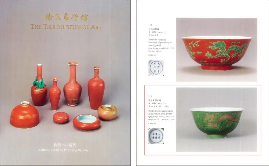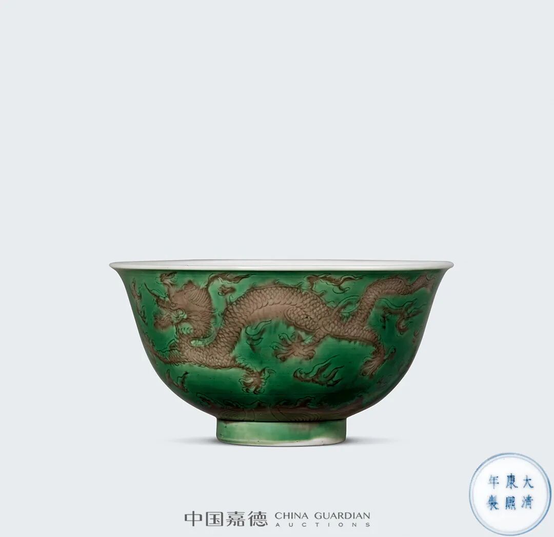 康熙一朝此类岁例用瓷传世数量远不及雍正、乾隆朝多,所见完美者极少,本品品相完美,实为难得一见的康熙御窑珍品。此碗造型典雅尊贵,胎骨细薄轻盈,绿地褐彩龙纹瓷器是清代官窑的传统品种。本品为清代后宫的岁例用瓷,清帝后妃中贵人使用。