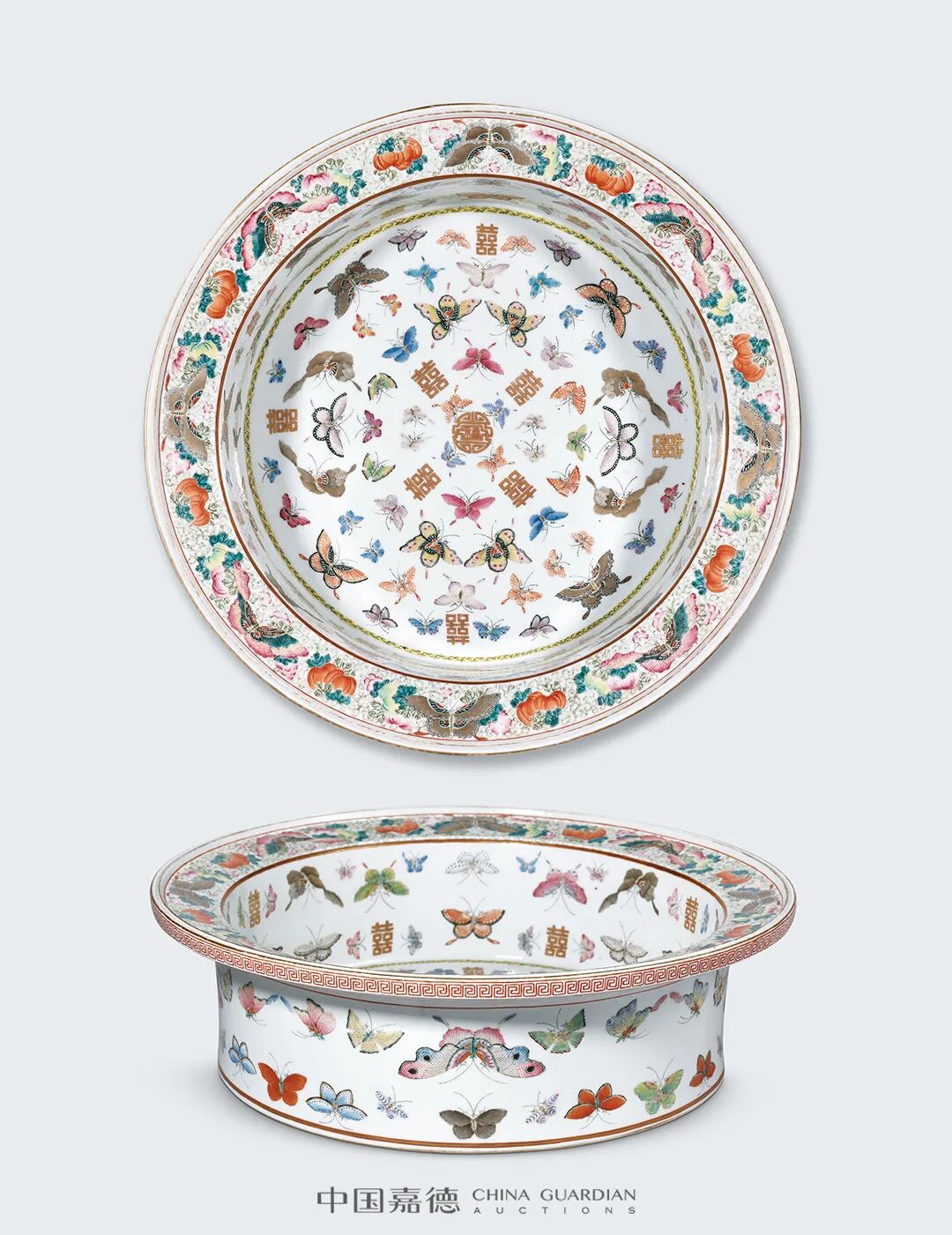 细观本品之装饰技巧,其基础纹样以繁缛华美的重复性连续装饰为主,但这种装饰并非枯燥的雷同,而是在诸多细节处给人别致而考究的观感体验,视之妍丽夺目。本品画意精致生动,栩栩如生,诸彩搭配映衬自然,寓意喜庆,为晚清御窑佳作。
