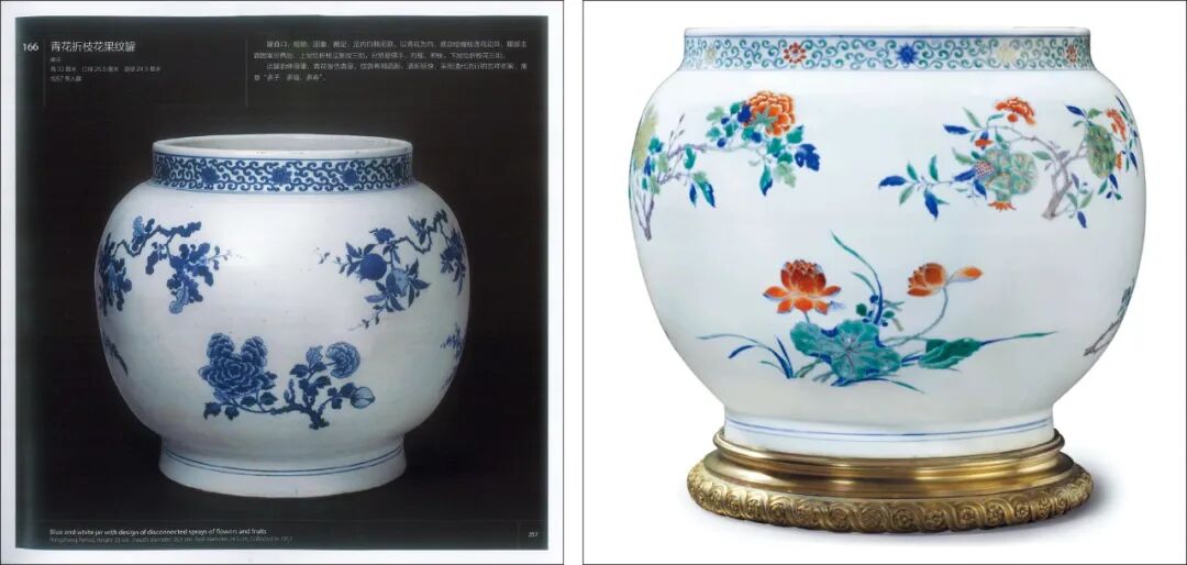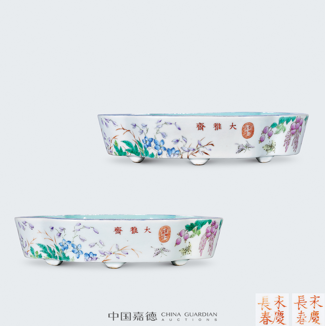 本品造型别致,工精质细,彩料妍丽丰富,不失为晚清名品,成对出现,颇值珍视。故宫博物院藏有此式紫藤花蝶纹海棠形花盆制瓷官样,当为慈禧自用传办御瓷。