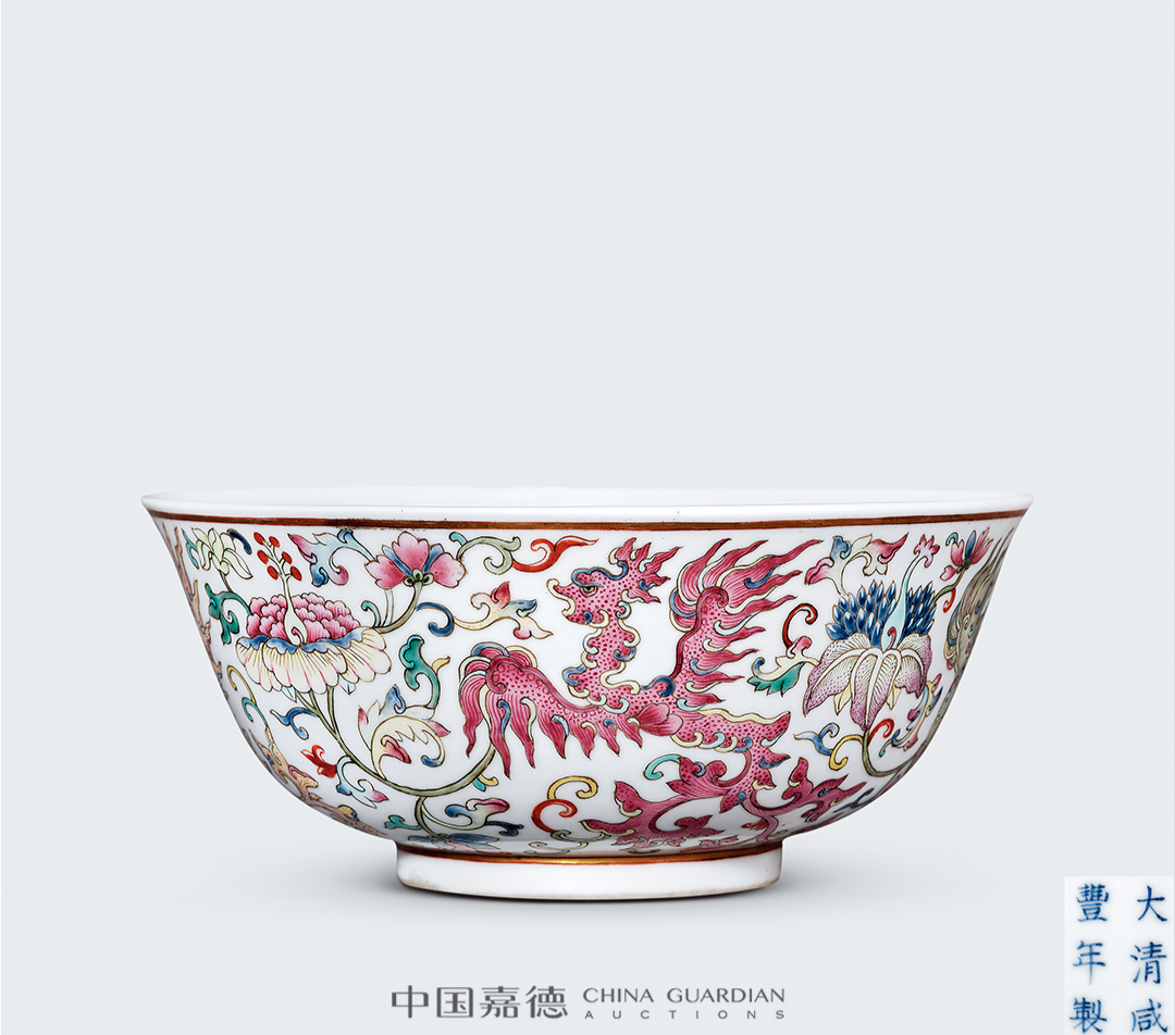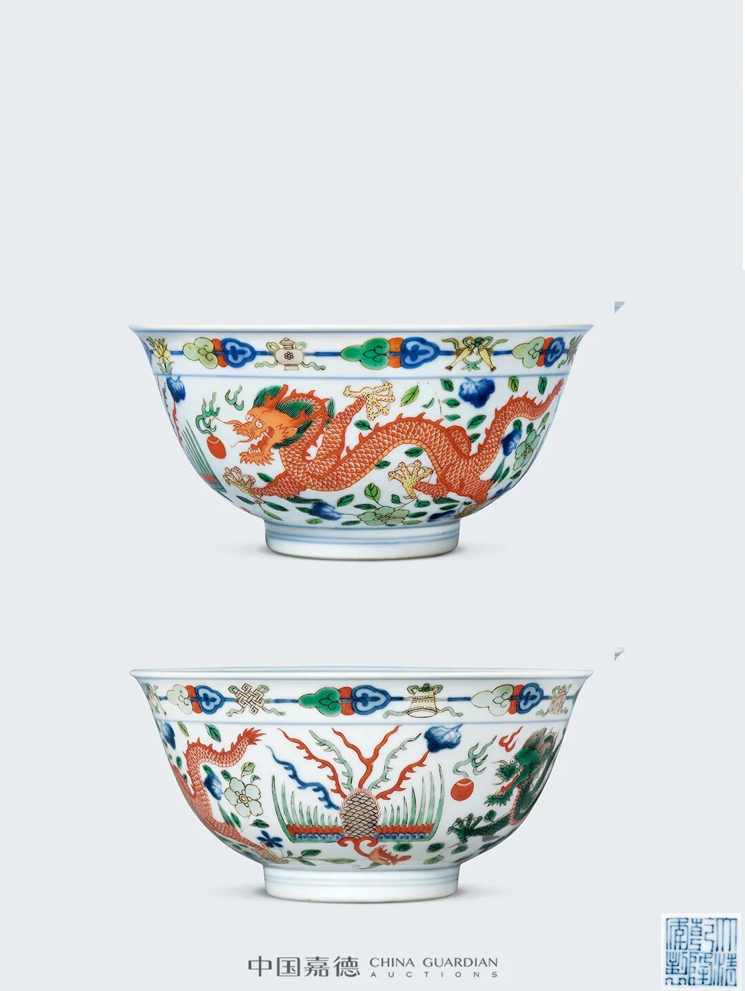 另据《国朝宫史》记载,宫中器用等级禁严,此式五彩龙凤碗当为皇室后宫专用,多用于饮宴等场合。本品造型端庄大气,纹饰构图严谨,画工精细,色彩艳丽,寓意吉祥,品相完美,品质极佳,颇值关注。