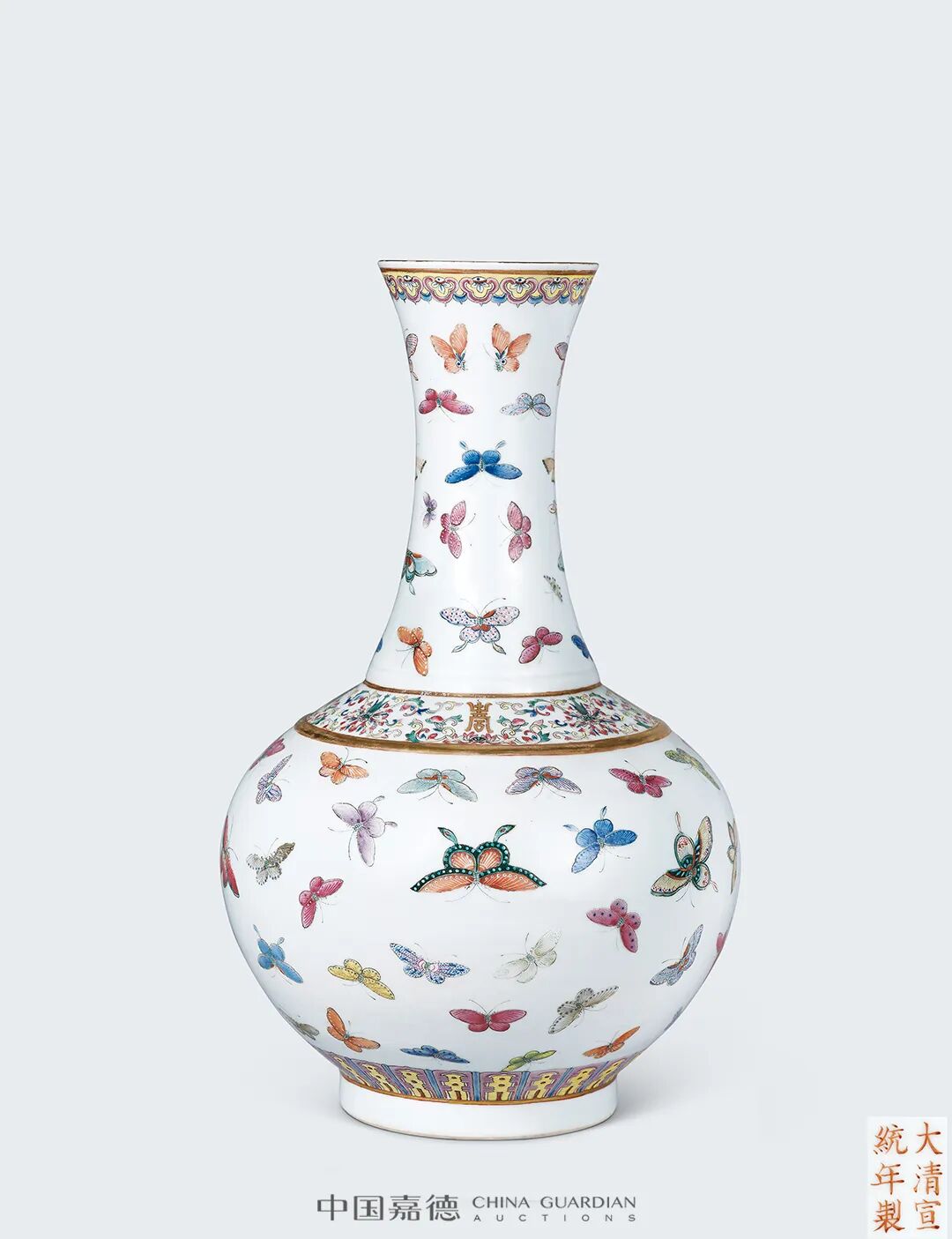 百蝶赏瓶为清代晚期官窑经典品种,但所见以光绪为多,宣统作品颇为少见。本品贵为一例,品相完美,品质精绝,自本公司2003年拍卖释出后从未现身,来源清晰可靠,颇值珍视。