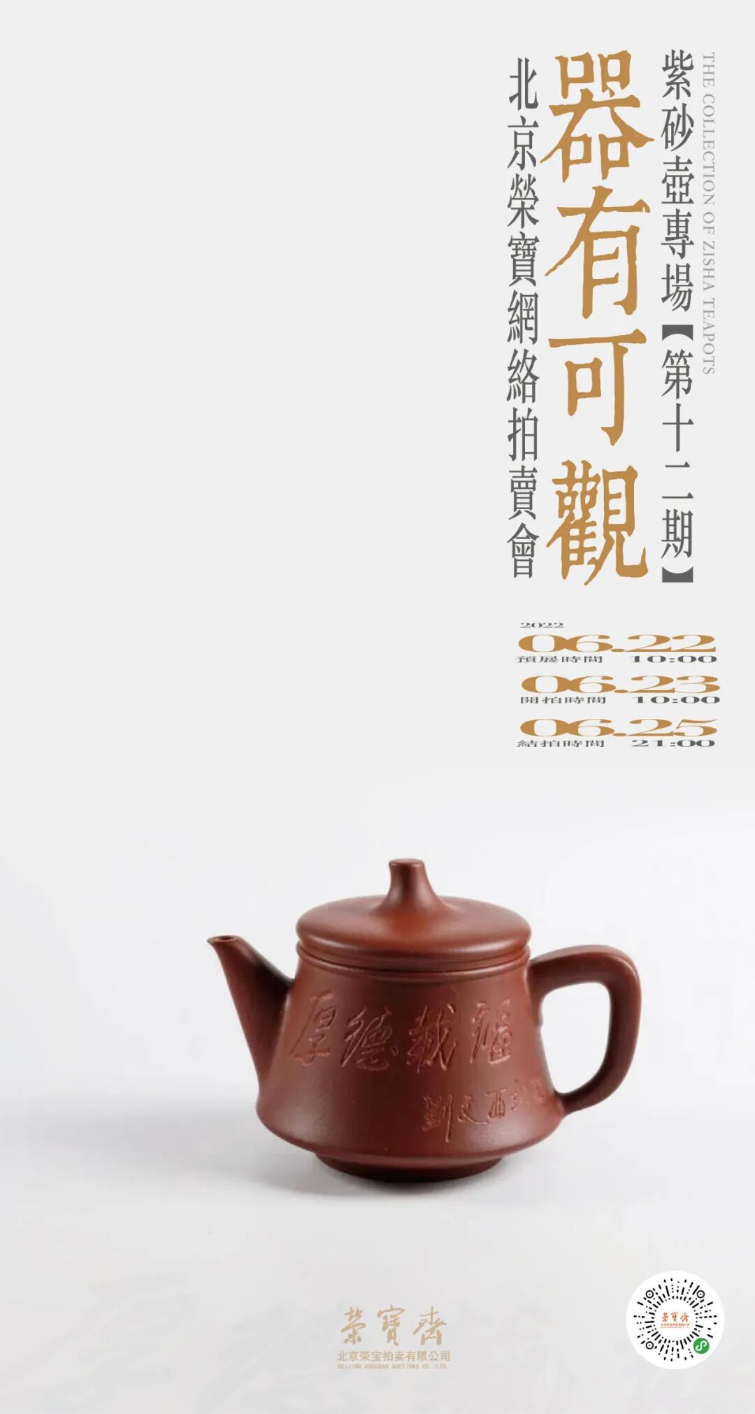 北京荣宝——器有可观紫砂壶专场网络拍卖会(第十二期)将于6月22日10:00-6月23日10:00开启线上预展,并于6月23日10:00开拍,6月25日21:00结拍。