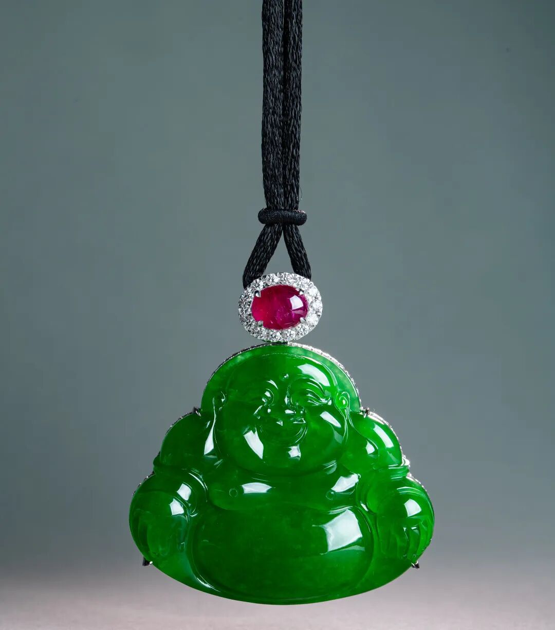 大肚能容 天然翡翠配鑽石及紅寶石「佛公」掛墜
