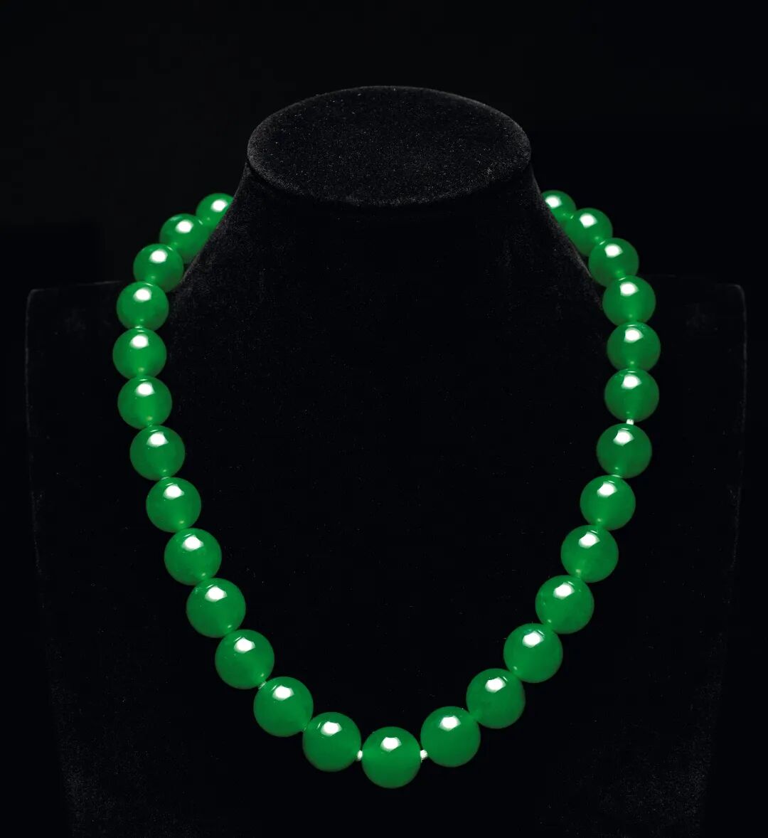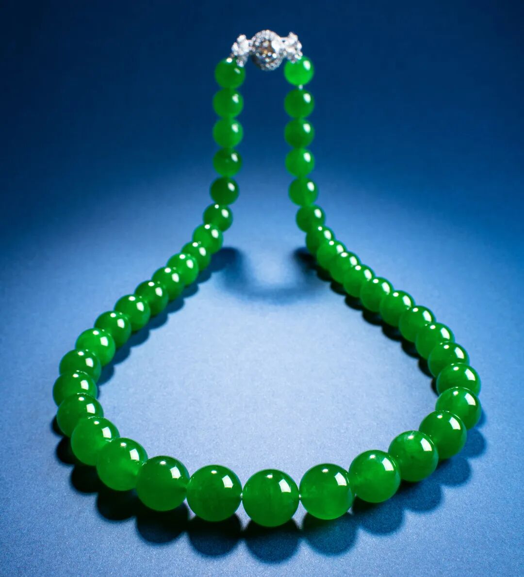 翡翠珠寶中,尤以珠鏈最耗時廢料,對原石的要求非常高,尤為珍貴。此次拍賣所甄選的這條翡翠珠鏈,由四十三顆碩大圓潤的天然翡翠珠串連而成,翡翠珠直徑約達到 13.60–11.50 mm,碩大罕有,且大小 均勻,色澤濃鬱。翠色艷麗欲滴,顆粒晶瑩純淨,放眼望去,其飽和度極高的明艷翠色溢滿雙目,懾人心魄。佩戴於身,散發出雍容優雅的氣質,絕對是一件無與倫比的藝術品。