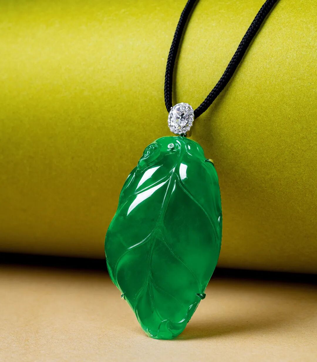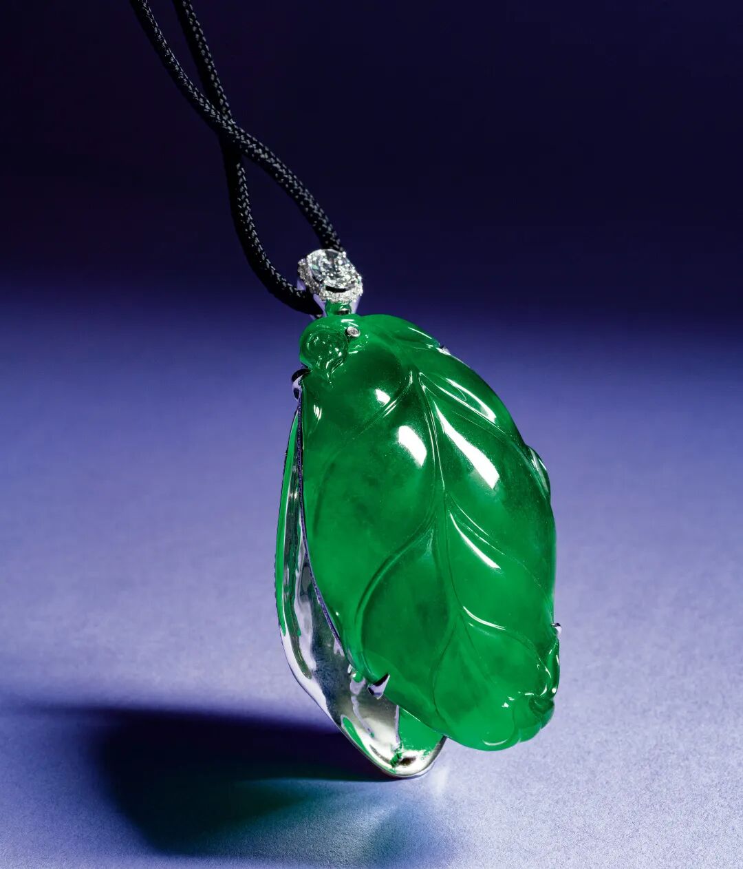 帝王綠翡翠向來是收藏者眼中的極品。此件翡翠葉子掛墜達到了古柏林 鑒定機構的「帝王綠」級別,是極少數被故柏林評為「帝王綠」的翡翠 牌掛墜,可謂稀世之珍。它通體滿綠,圓潤通透,綫條柔美,尺寸碩 大,達到約 59.1 × 33.4 × 9.56mm。它由傳統匠人根據原石本身的形態進 行精心設計,並用超高的工藝細心雕琢,配以鑽石鑲嵌,背面更用紅寶石組成兩隻穿梭於林間的蝴蝶,實爲一件生機盎然的頂級翡翠藏品。