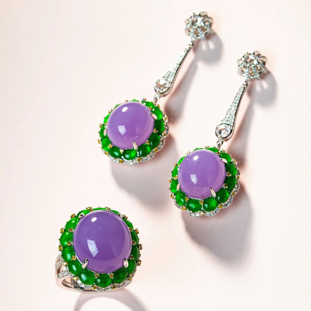 天然紫羅蘭翡翠配鑽石戒指及耳環套裝