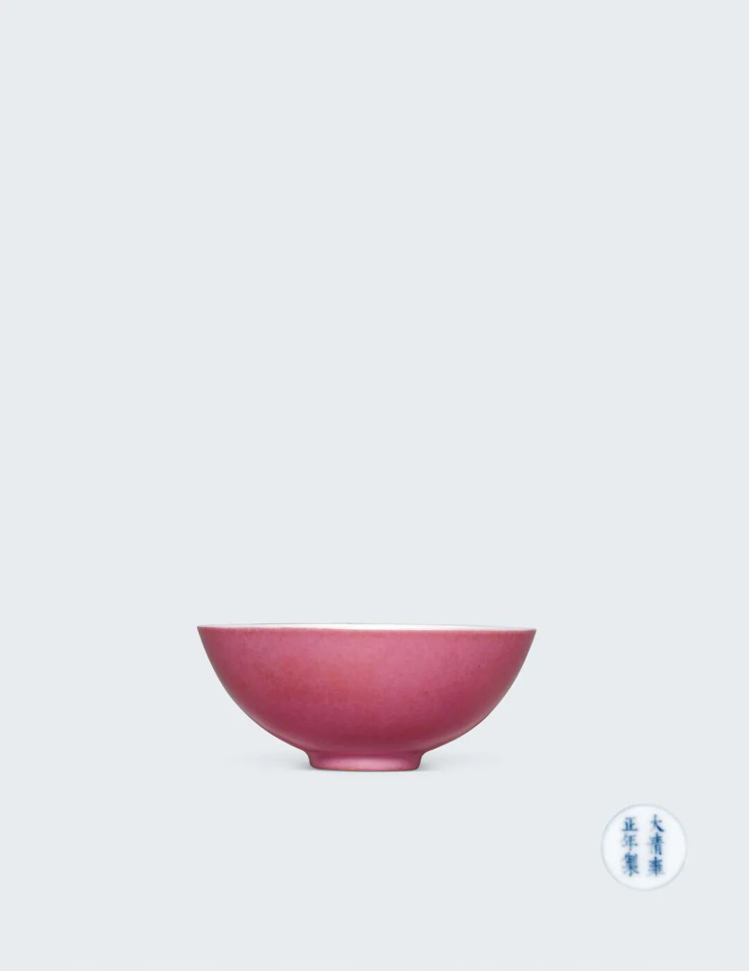此碗尺寸硕大,造型端正规致,沉稳大气。器身施珊瑚红釉,色泽娇浓沉郁。碗身外壁浅刻莲花荷叶图案,荷花花瓣饱满盛开,荷叶分布高低错落,叶面翻卷,十分华美。碗内中心作圆形纹饰,中间绘宝杵图案,周围作中心对称花纹。宣统一朝历时仅三年大清王朝即告覆灭,故宣统官窑所製数量十分有限,此件大碗製作精细,十分罕见。北京故宫博物院收藏有相同藏品,其形制与本藏品完全一致,可为重要参阅。