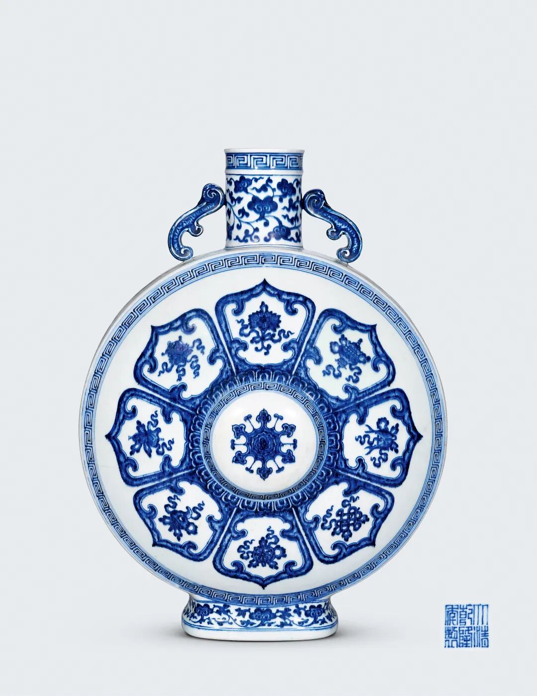 蒜头瓶因瓶口形似蒜头而得名,始见于汉代青铜器造型,瓷製者则以明嘉靖、万历两朝为盛。清代官窑沿用此种器形烧造宫廷陈设用瓷,尤以乾隆时期的青花品种较为名贵。据《乾隆记事档》载,乾隆三年六月二十五日,乾隆帝就曾命太监高玉传旨将内府旧藏一批明代瓷器,交付景德镇御窑厂让唐英仿烧,其中就有“宣窑青花白地蒜头瓶”。此品种两岸故宫博物院及南京博物院均有收藏。