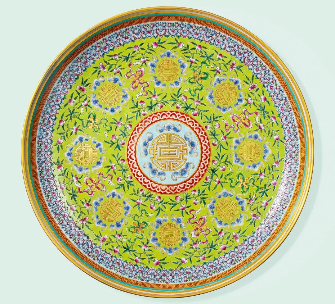 清光绪 绿地粉彩描金万福万寿纹大盘