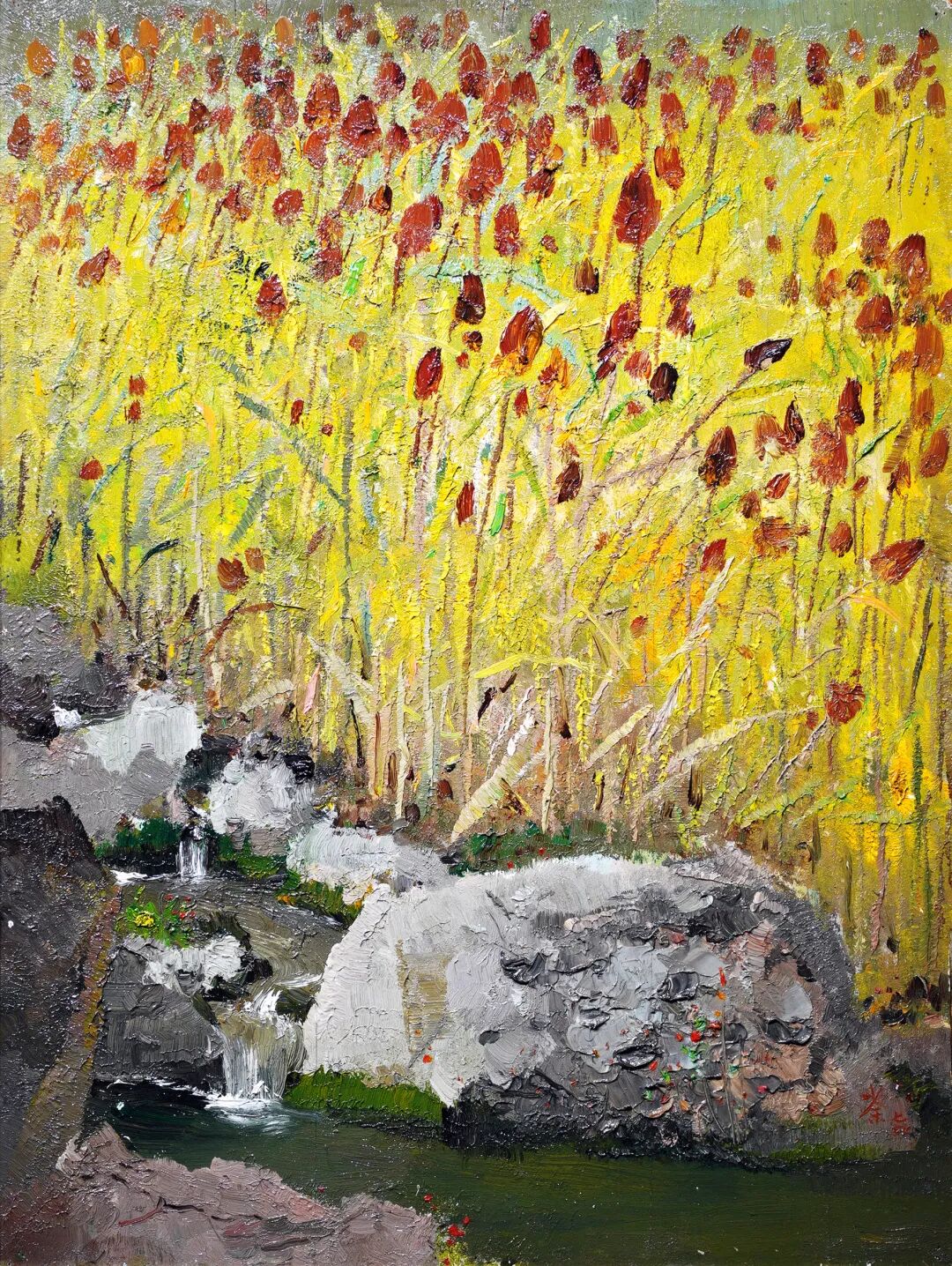 在吴冠中先生丰富多样的创作题材中,“高粱”着实有着极为特殊的意义,其原因便是画家在它的陪伴下度过了一段难忘的艰难岁月。文革时期,吴冠中被下放到河北农村劳动,在长达七、八年的时间内被禁止作画,直至1972年才被允许每周作画一天。由于农村条件艰苦,绘画材料受到了限制,不得不利用粪筐作画箱和画架,他也因此被戏称为“粪筐画家”。这一时期,他的绘画素材都是北方乡村的寻常之物。创作于1972年的《高粱与棉花》是吴冠中最早的高粱题材画作,画家后来在《吴冠中画作诞生记》中解释了高粱与自己在精神上的关联性:“粮食是我的图腾。南方的水稻和小麦个儿都矮,北国的高粱高高挺立,显得风姿绰约,而且威武。下放劳动,种过各种庄稼,看高粱从幼苗而青春。满身苍翠,秋,通体艳妆。赤红的脑袋在蓝天摇曳,实是一种骄傲。”此幅《高粱溪流》作于1974年,吴冠中当时已经从农村返回北京,并在回京之后迎来了创作上的旺盛期。此时的吴冠中,在艺术上仍然延续了下放劳动时期的“乡土写实主义风格”。与《高粱与棉花》有所不同,《高粱溪流》或许是因为画家在1974年初开始重新创作水墨画的缘故,在自觉与不自觉之间已经在纯正的油画材料和语言中显示出水墨画的笔墨韵味。在流水击石,风声呼啸之中,吴冠中赋予这种田间之物一种高雅的气质。吴冠中一生都对高粱念念难忘,在1995年时他又创作了《青高梁》一作,晚期的作品仿佛含着深情,但在色彩和形式上都呈现出了强烈的风格化特征。高粱溪流》采取了一种简单却极具设计感的构图方式。高粱地与溪水的分界线在画面中构成一条倾斜的直线,右上侧的高粱地麻,鲜艳的金黄色调令人感受到饱满旺盛的生命力,溪水部分定偏于灰绿的冷色调,两者构成了冷与暖、高与低、动与静的对比为了表现出高粱的密不透风的状态,使用了一种结合了印象不享涂法的特殊技法,用浓稠的颜料进行层层堆砌,涂抹期间再掺杂以斑斓的色彩和刮刀的痕迹,色调从深到浅变化微妙,这样画出来的高粱并不是根根独立,但整体上层次丰富,赤红的高粱穗在黄绿色枝杆的映衬下显出成熟的风姿。前景的溪水中大小岩石错置,几道水流从石头的隙中婉转而下,这是山水画中常见的组合方式,以其与高粱搭配,呈现出一种文人诗意和浪漫主义色彩。