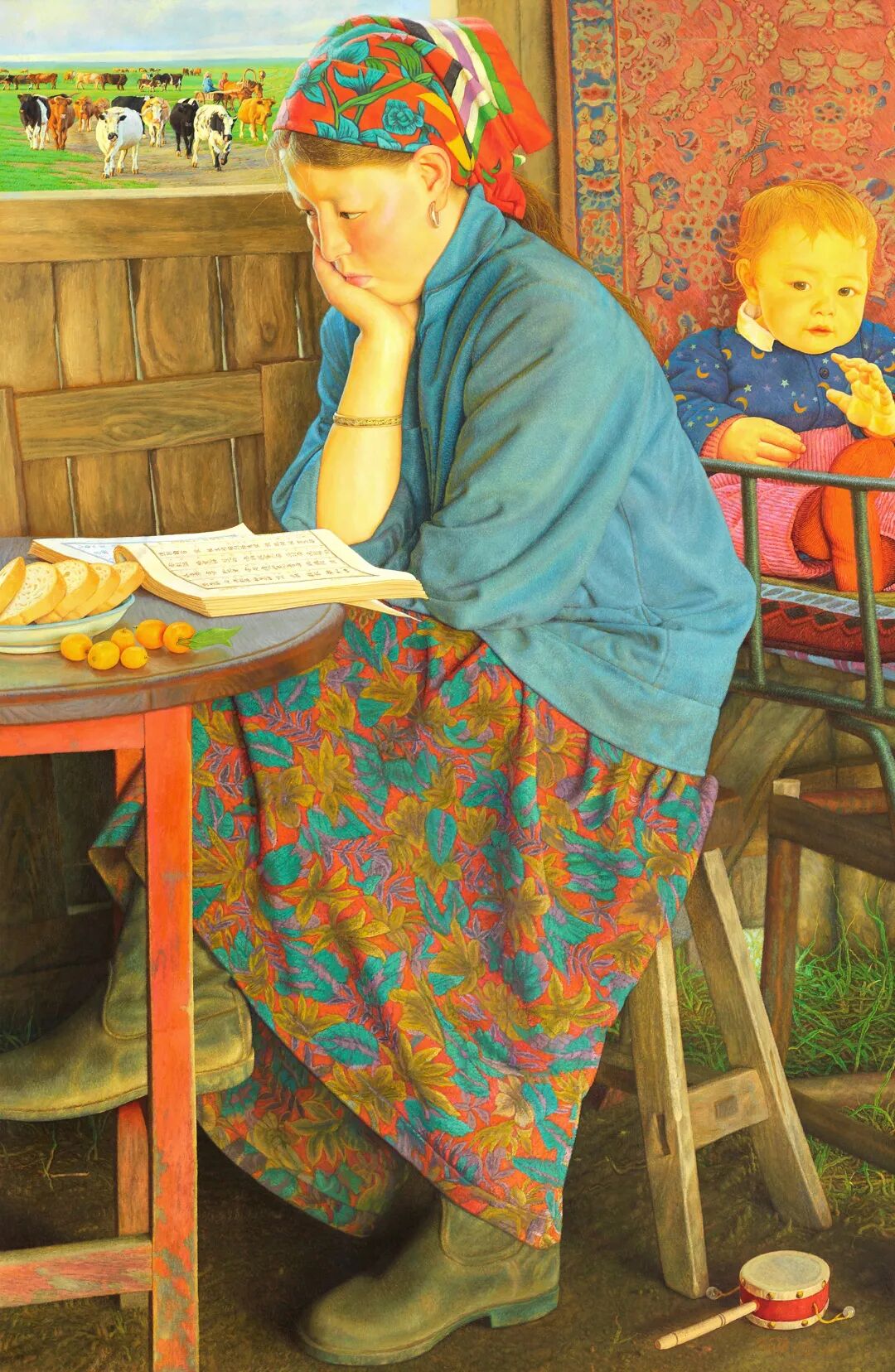 可以说我人生的第一张画就是《读书》。后来我去了草原,在一个木板房里面,看一位年轻的母亲一边读书,一边照顾小孩。这个场景唤起了我所有的记忆,产生了要创作这张画的冲动。我的画,表面上看是和谐宁静、行云流水,其实都是殚精竭虑、苦心经营而来。从构图、光线、用笔到人物关系、前后呼应,乃至衣饰陈设、每一物体、每一细节无不精心推敲,必止于至善方才罢手。画中妈妈翻开的书是《蒙古秘史》,相当于汉人的《史记》,窗外无尽的草原是空间的延展,而书籍则复万史的纵深。